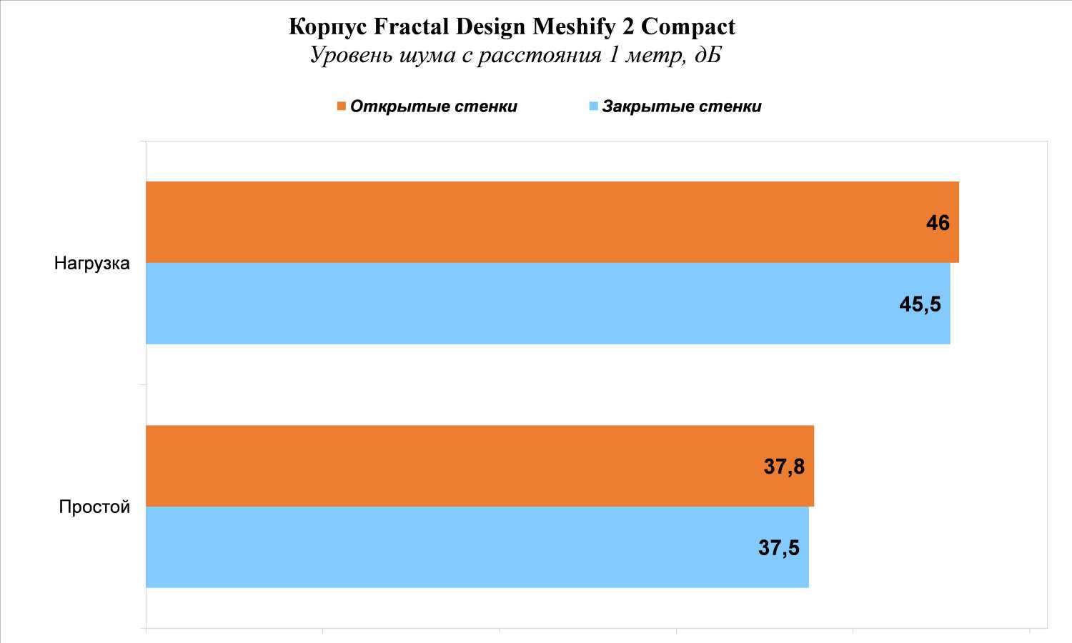 Использование трех вентиляторов в корпусе сказалось на уровне шума. В простое работа корпусных вентиляторов на их максимальных оборотах в Mid-Tower корпусе Fractal Design Meshify 2 Compact слышна достаточно хорошо, но не сильно «напрягает». Нагрузка показывает, что корпус не так сильно гасит уровень шума, что объясняется особенностями конструкции, направленной на достижение лучшей вентиляции, и, как следствие, будут хорошо слышны звуки работающих систем охлаждения процессора и видеокарты.