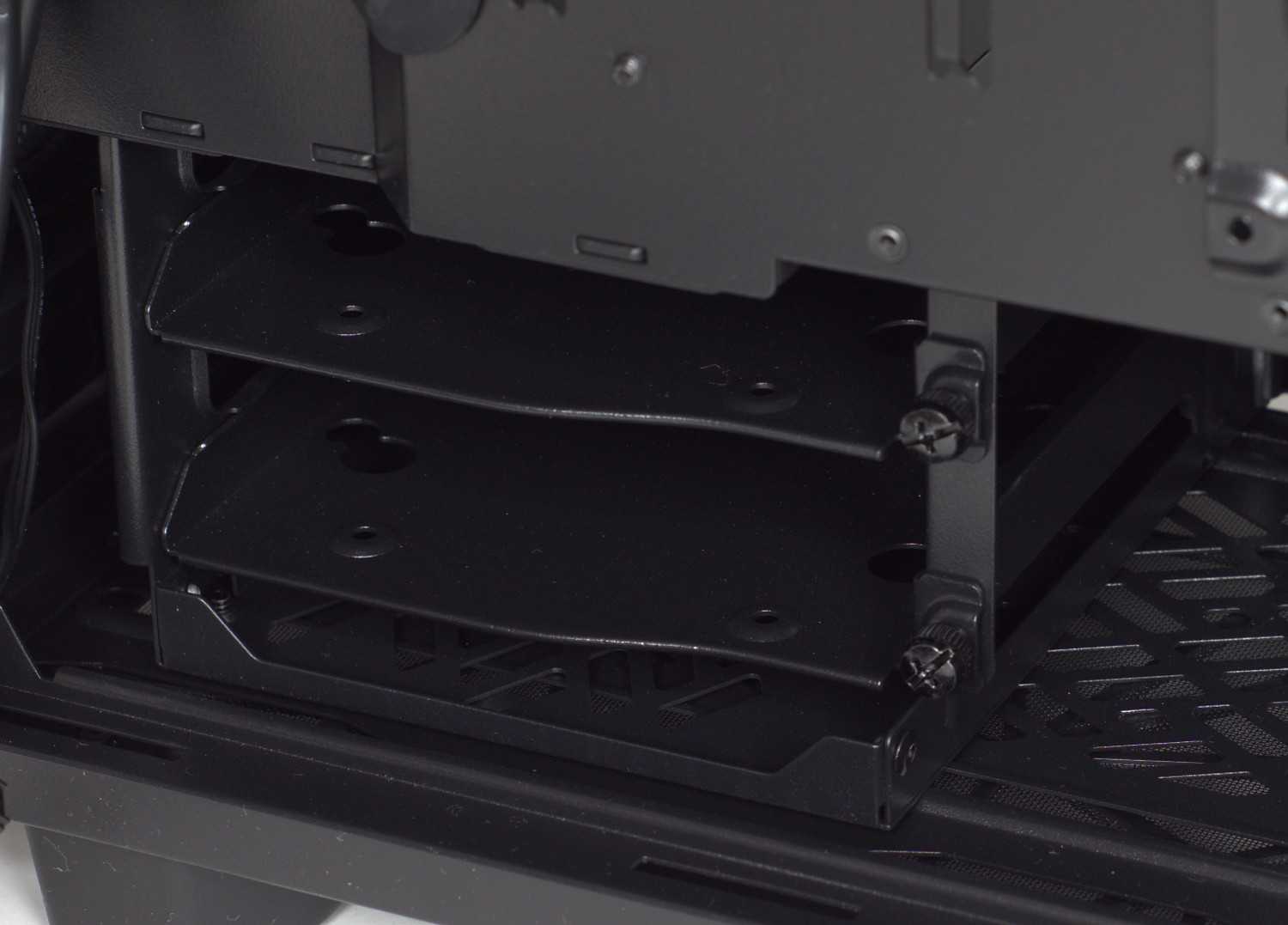 При использовании накопителей в нижнией корзине их лучше всего установить заранее, чтобы в дальнейшем вытягивать кабели блока питании и интерфейсные. Непосредственно 3.5″ накопители фиксируются в салазках винтами через силиконовые демпферы.