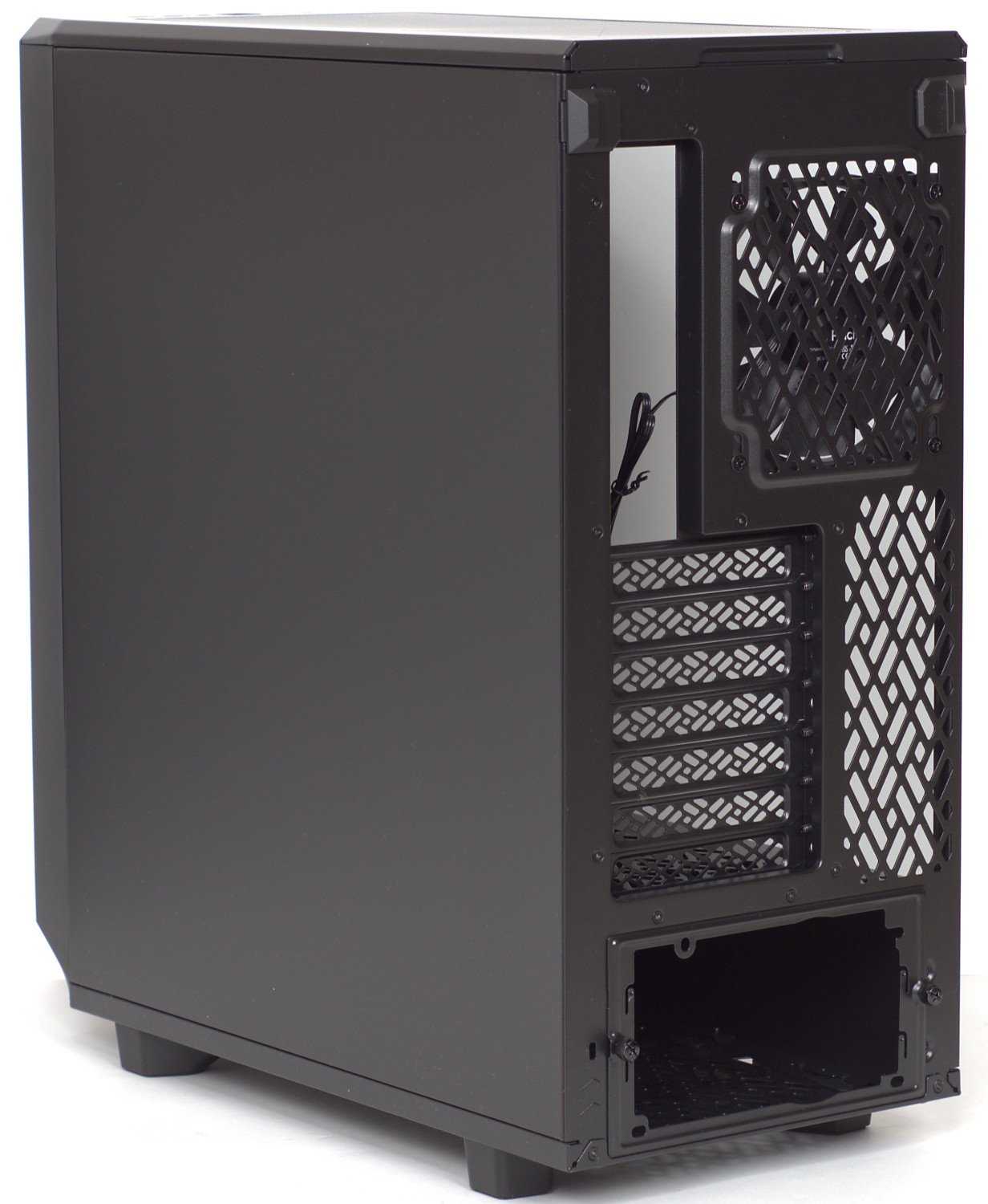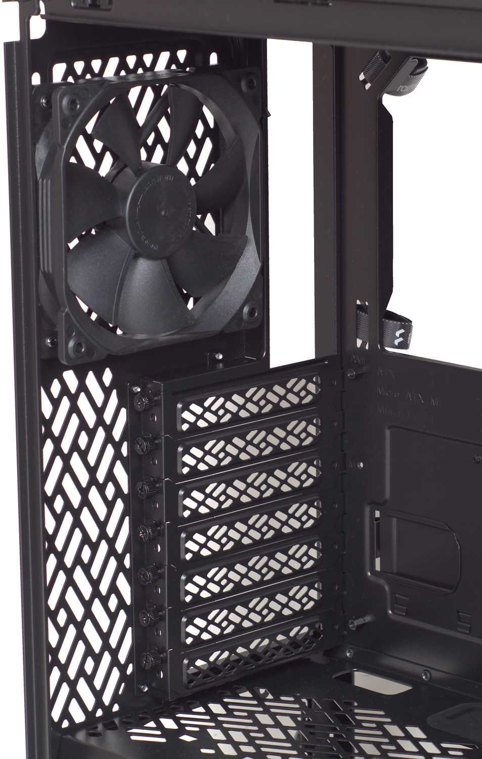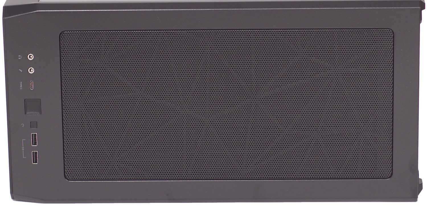 Лицевая панель имеет оригинальную форму ангулярной сетки с выступающими частями. Таким образом производитель постарался обеспечить максимальный приток воздуха спереди. Уменьшение ширины корпуса сказалось на конфигурации задней стенки, на которой нет возможности установки видеокарты в вертикальном положении как в старших моделях (зато в этой области появилась перфорация) и предусмотрен монтаж только 120 мм вентилятора, который уже установлен.