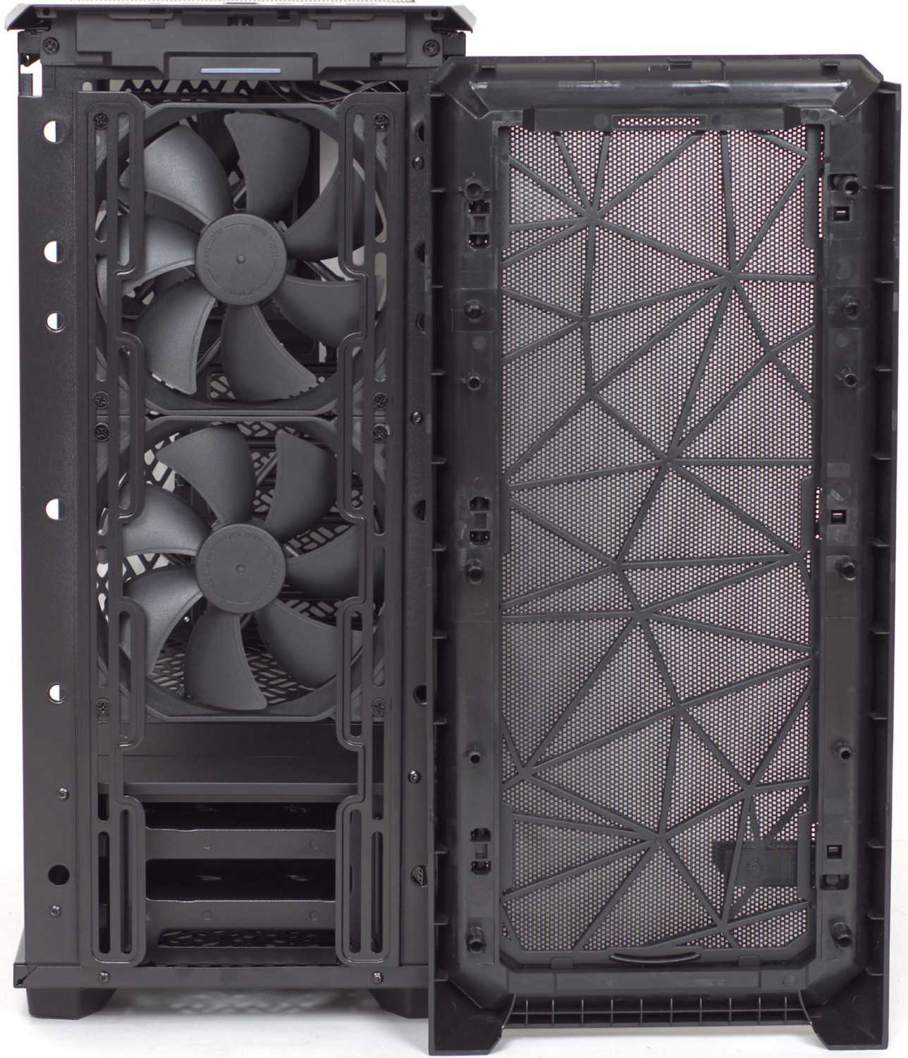 Доступ к передним вентиляторам осуществляется путем демонтажа лицевой панели. Посадочные отверстия допускают монтаж до трех 120 мм вентиляторов или двух 140 мм, либо радиатора системы жидкостного охлаждения (СЖО) до 280/360 мм.