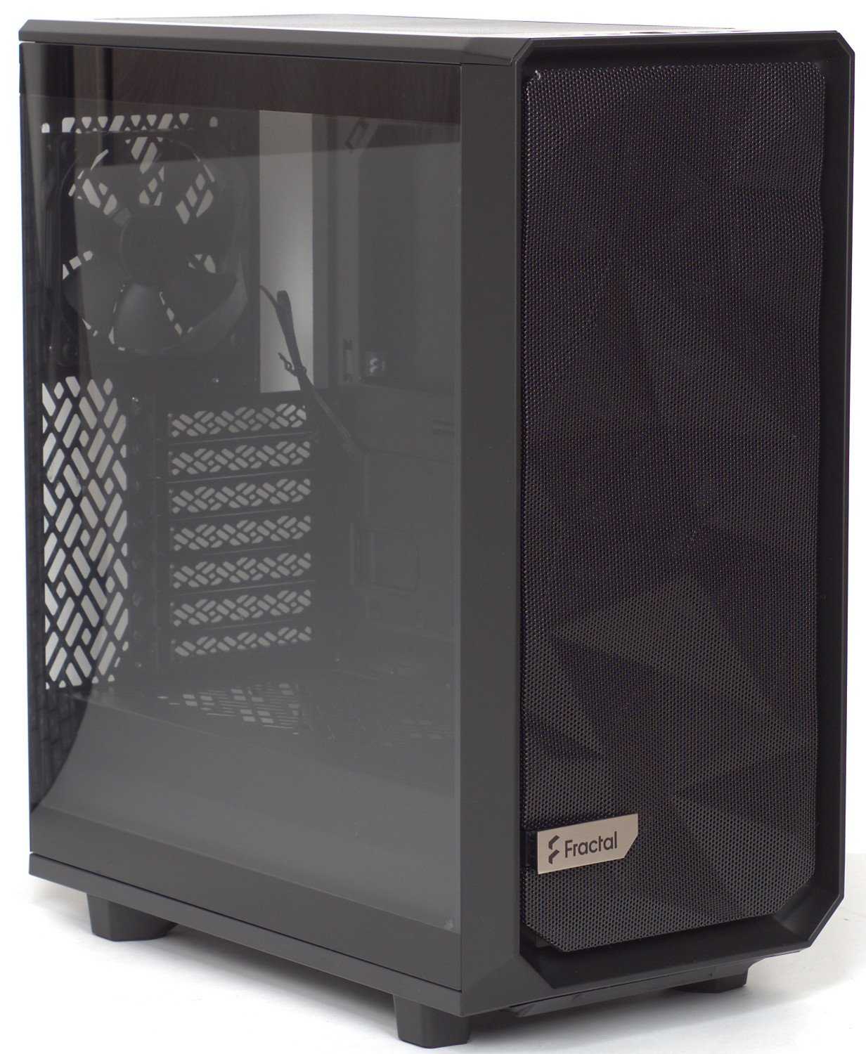 Circling around the case, it’s immediately clear that this is a Fractal Design chassis – if not from the ‘Fractal’ text on the front mesh’s door handle, you can tell from the folds in the mesh and the grille pattern that’s also unique to Fractal Design.