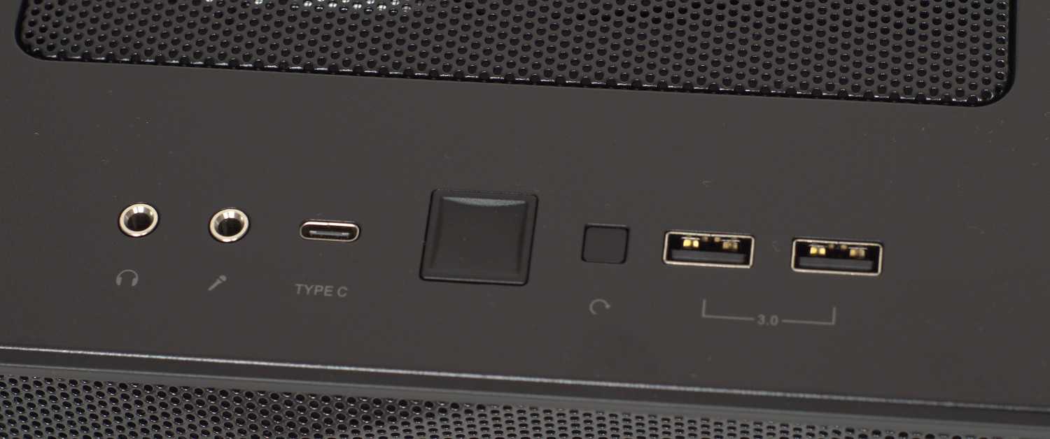 Только спереди разместились органы управления (кнопки питания, сброса) и порты ввода-вывода: разъемы HD-аудио (наушники, микрофон), порт USB 3.1 Gen 2 тип-C и пара портов USB 3.0.