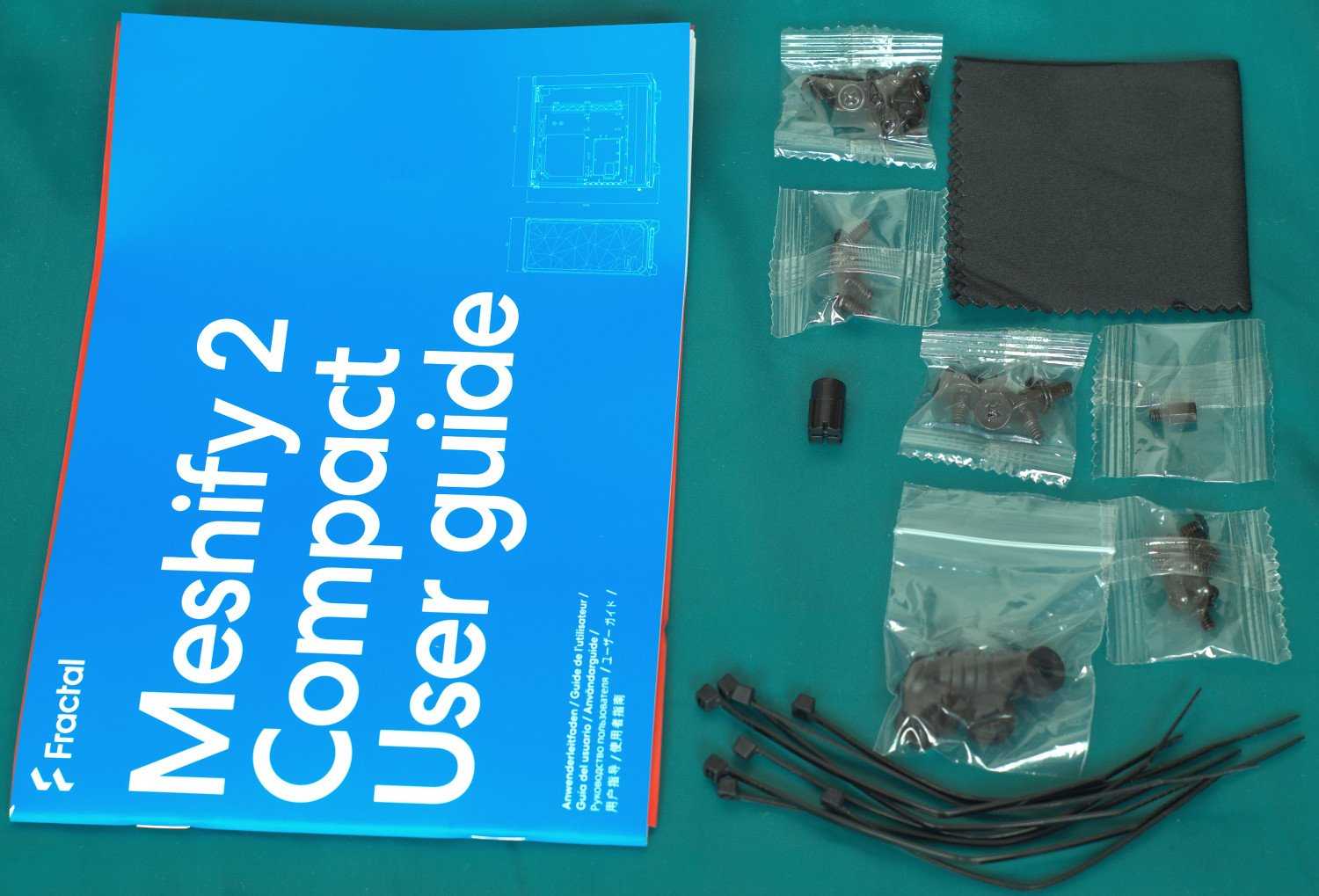 Комплектация у корпуса достаточная, чтобы обеспечить сборку системы. В небольшой коробке можно найти руководство пользователя, одноразовые стяжки, наборы винтов, демпферы для установки 3.5″ накопителей и тряпочку для протирки.