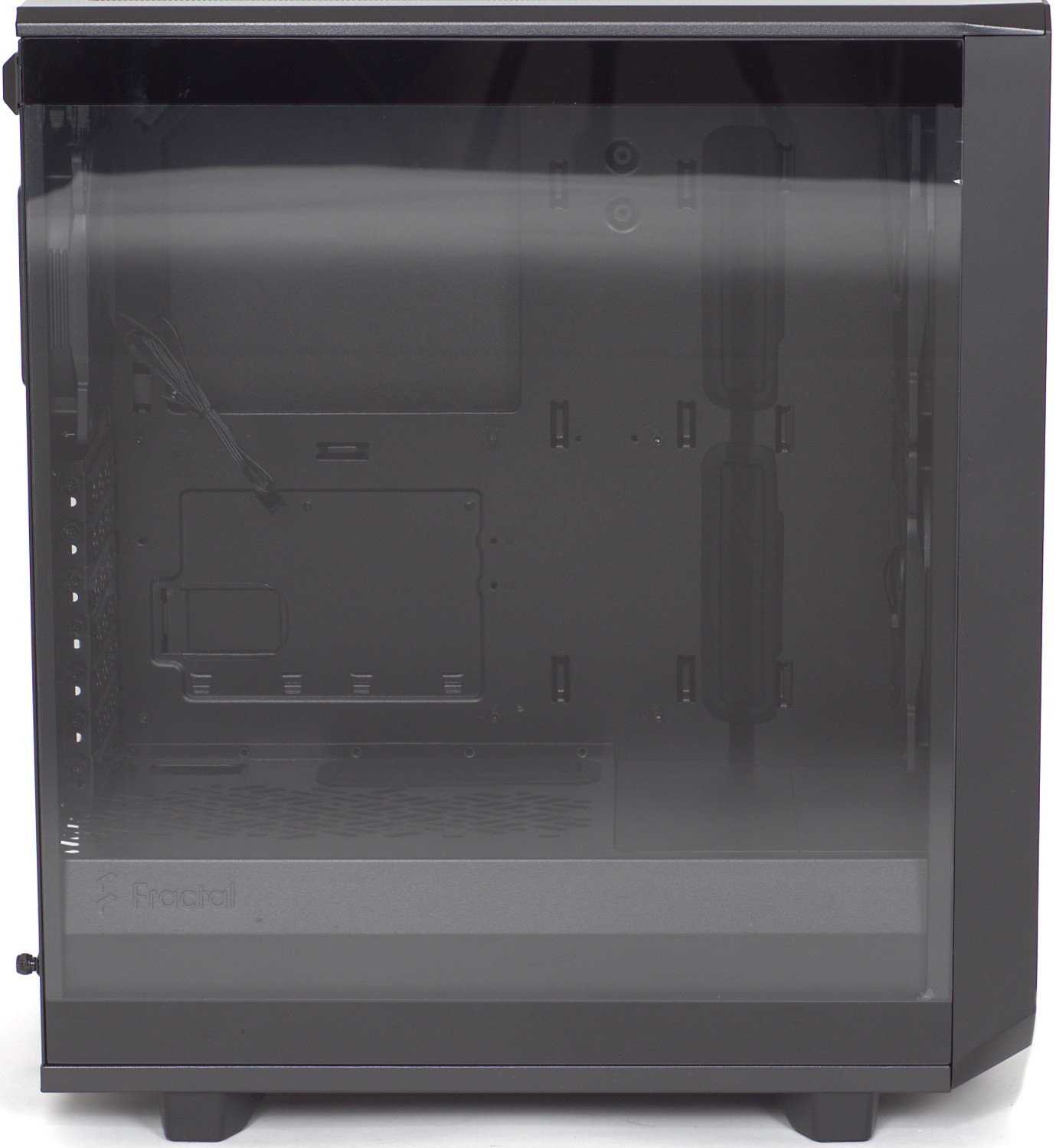 The panel on the right side of the case is a simple sheet of steel, while the left panel on our review unit is constructed out of tempered glass. Fractal Design also offers an alternative version of the Meshify 2 that omits the glass and has steel panels on both sides, but other than that, the two cases are identical.