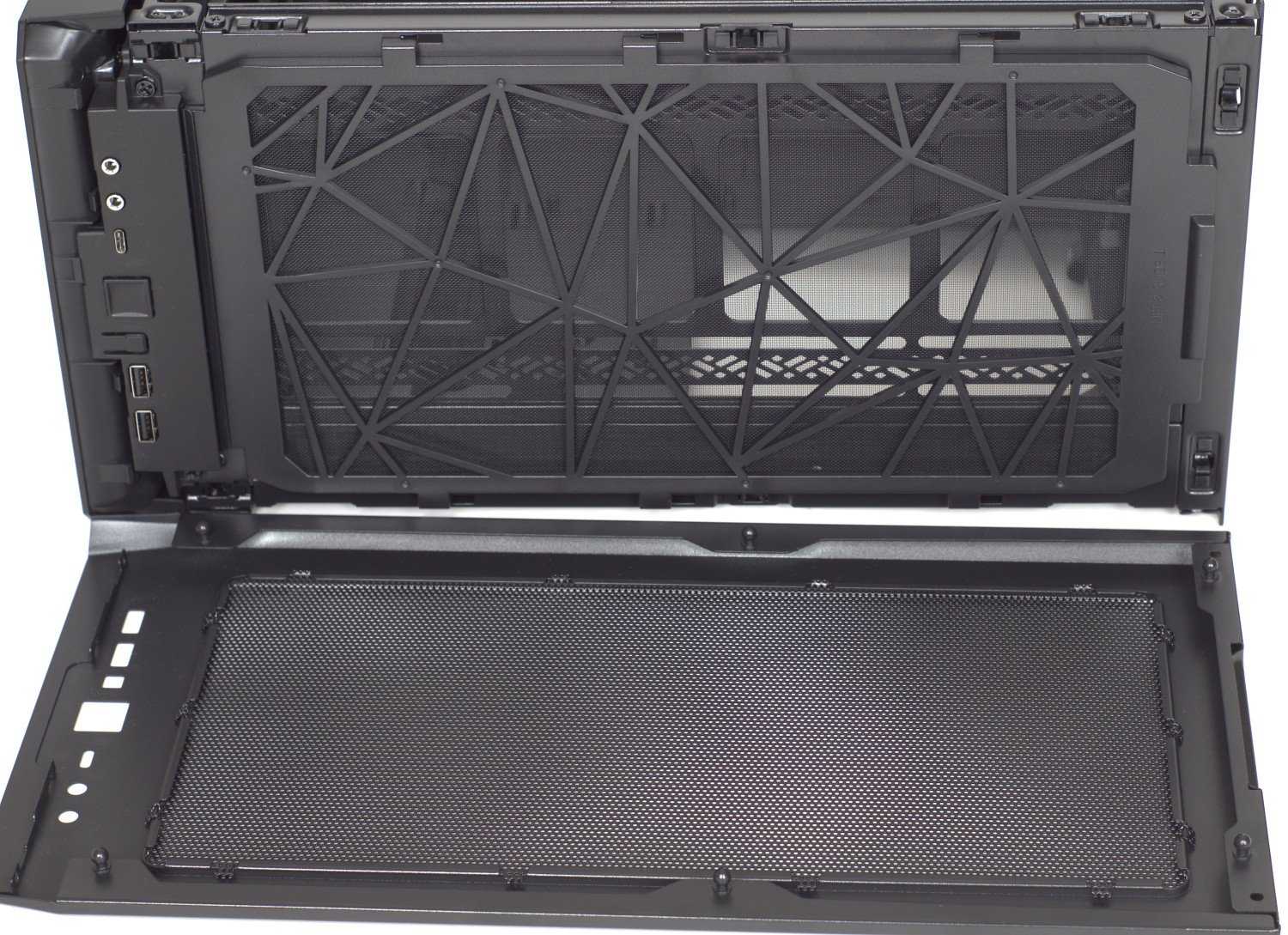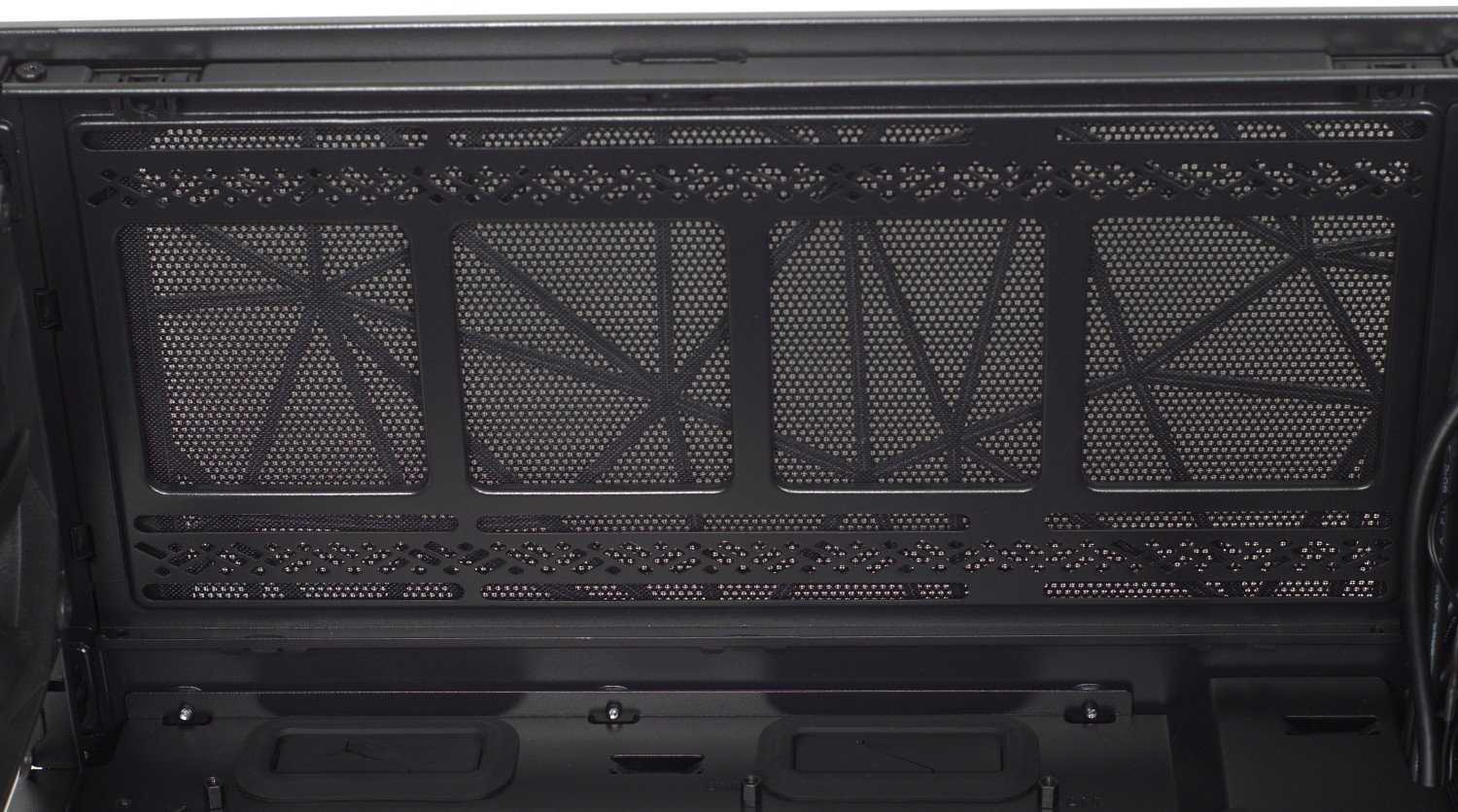 Так как корпус ориентирован на обеспечение лучшей вентиляции, то установка вверху панелей-заглушек, которые имеются в корпусах серии Define, не предусмотрена. Большая часть верхнего пространства корпуса имеет перфорацию.