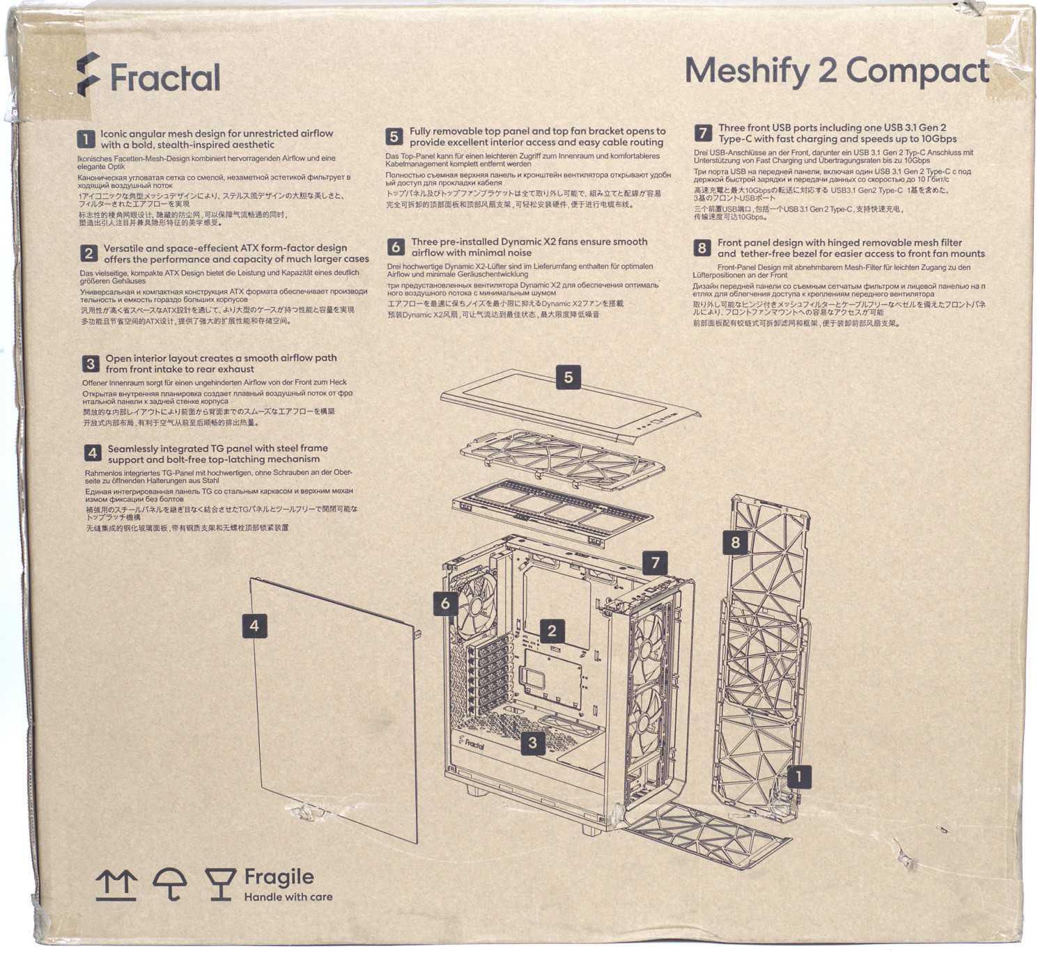 В настоящее время достаточно трудно ожидать от производителей корпусов коробки с оригинальным дизайном/цветной печатью, и упаковка Mid-Tower корпуса Fractal Design Meshify 2 — не исключение: обычная картонная коробка с удобными боковыми ручками и информационной частью на ней. Из интересного можно отметить наличие на лицевой стороне рядом с изображением корпуса технических характеристик, а с обратной стороны — подробного описания конструкции на нескольких языках, включая русский.