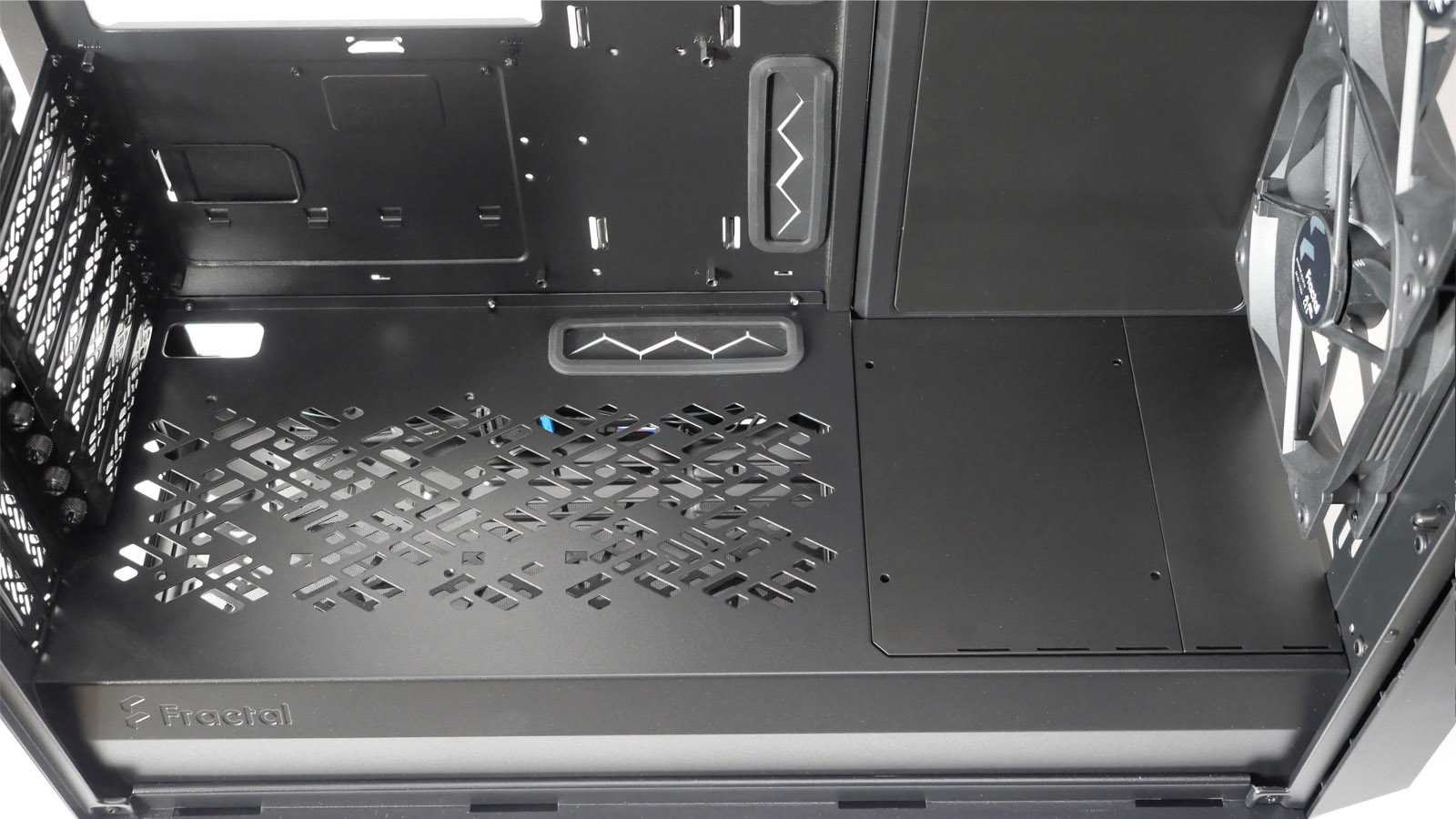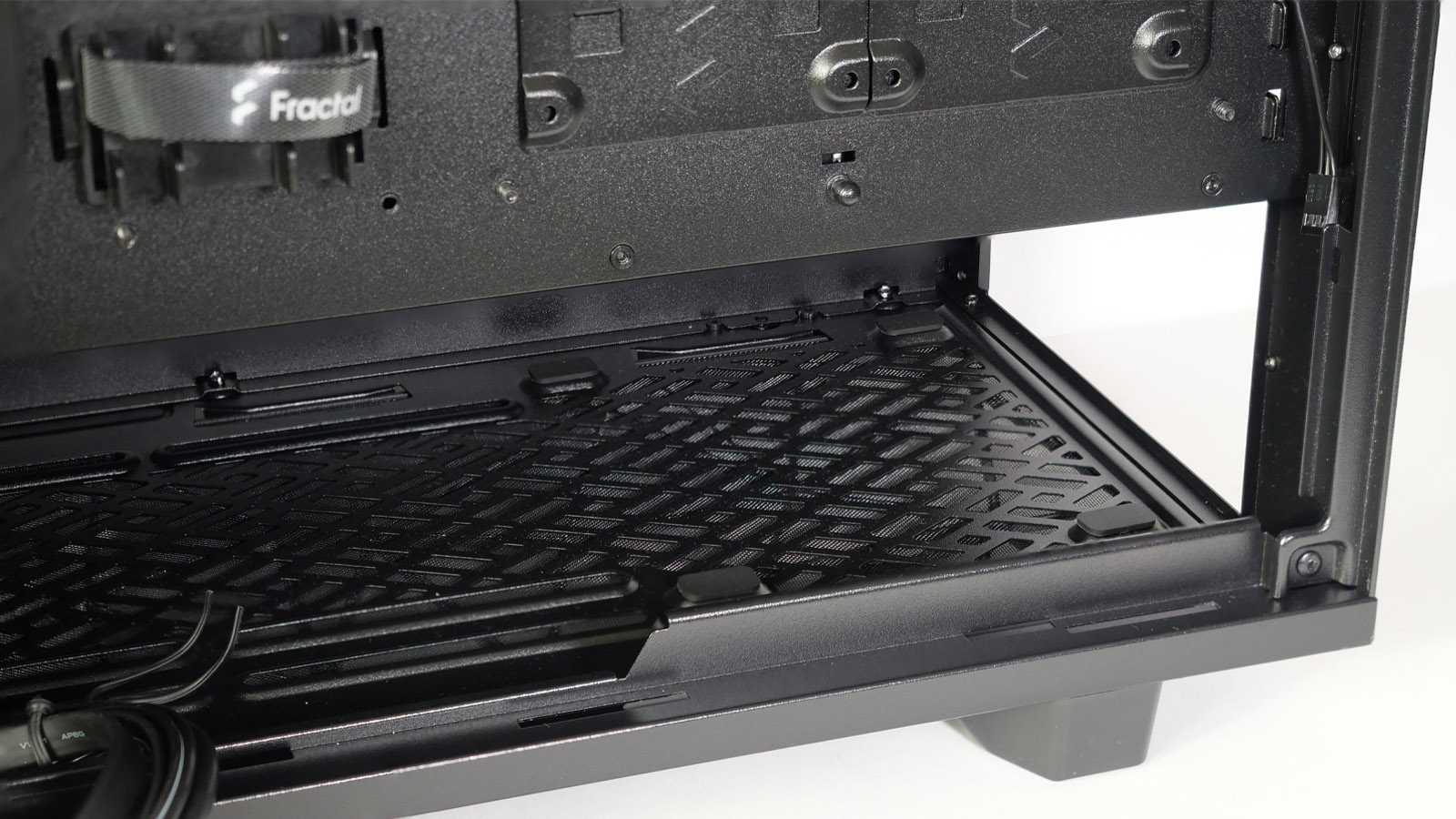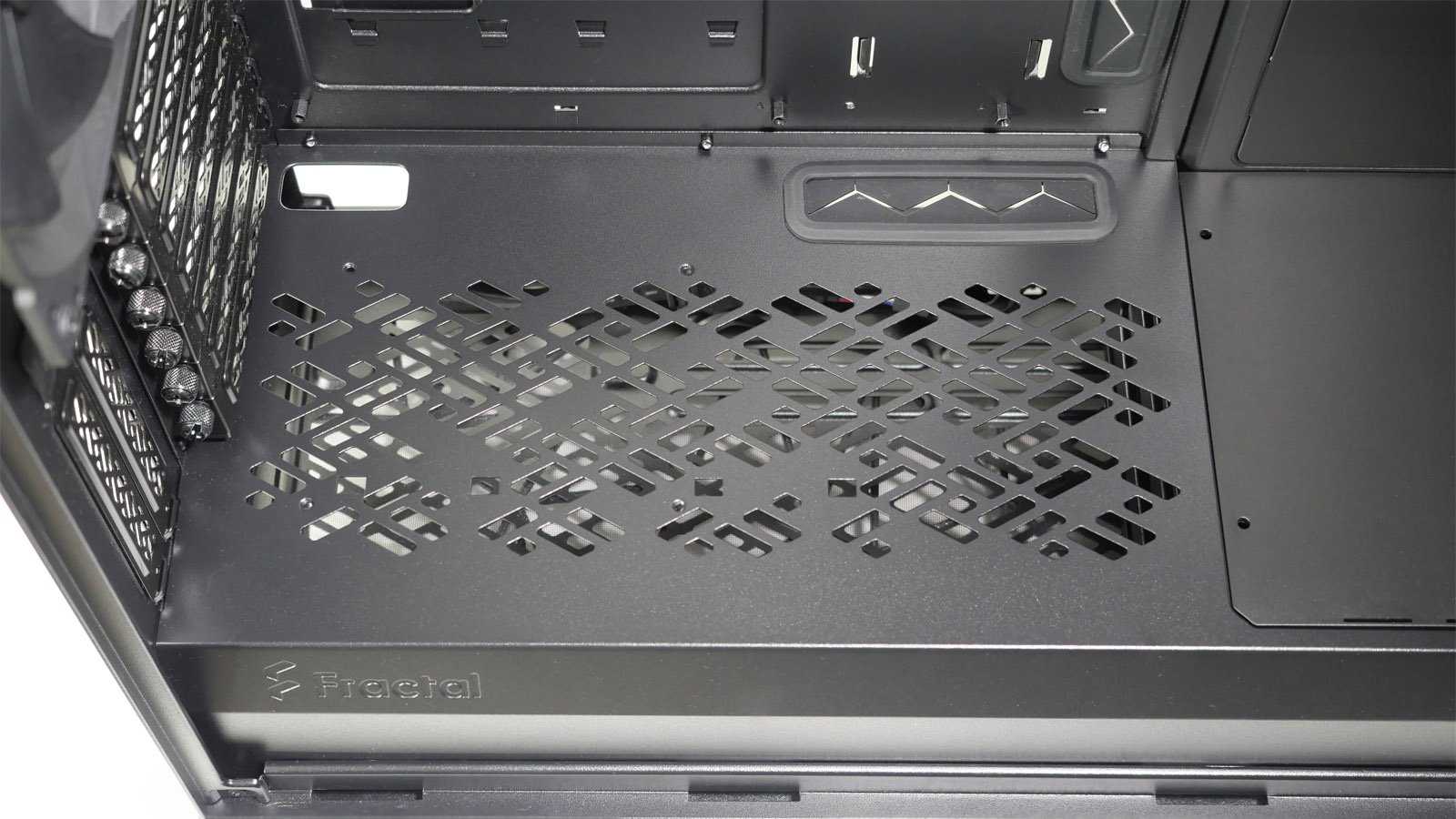 Нижняя часть корпуса отделена несъёмной металлической перегородкой, обильно перфорированной стильным узором по верхней части. В ней сделаны необходимые отверстия для подведения проводов от фронтальной панели к разъёмам на материнской плате. Удлиненное окошко используется в том числе для вывода кабелей питания PCI-E и дополнительно закрыто резиновой лепестковой заглушкой. С фронтальной части перегородки около выдавленного логотипа Fractal нет вырезов, открывающих взор на блок питания, поэтому модели с интегрированной подсветкой использовать нет смысла.