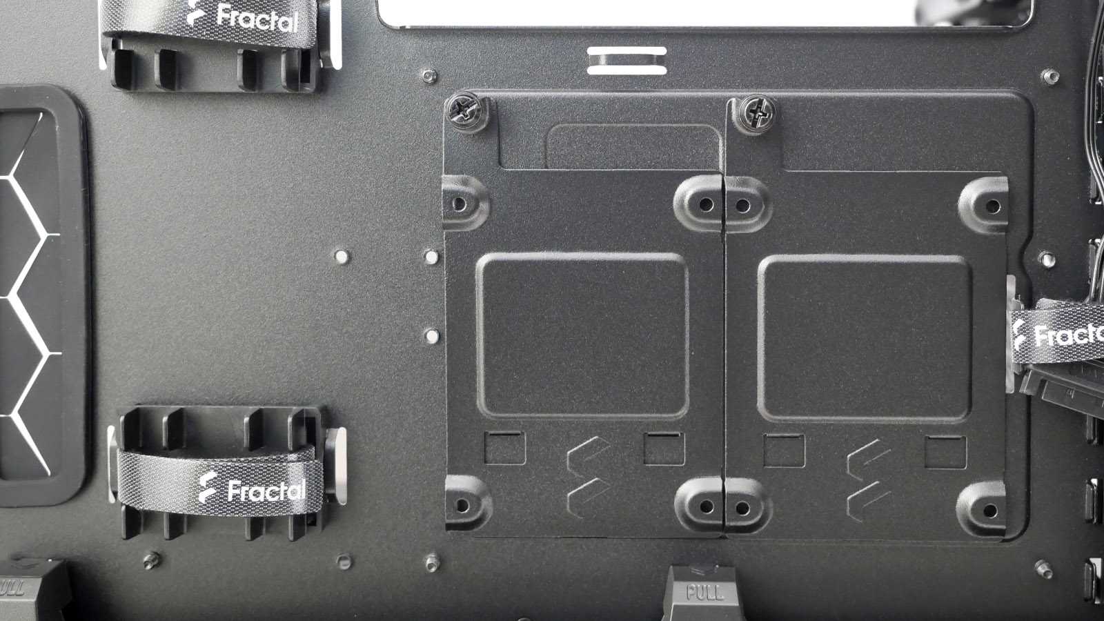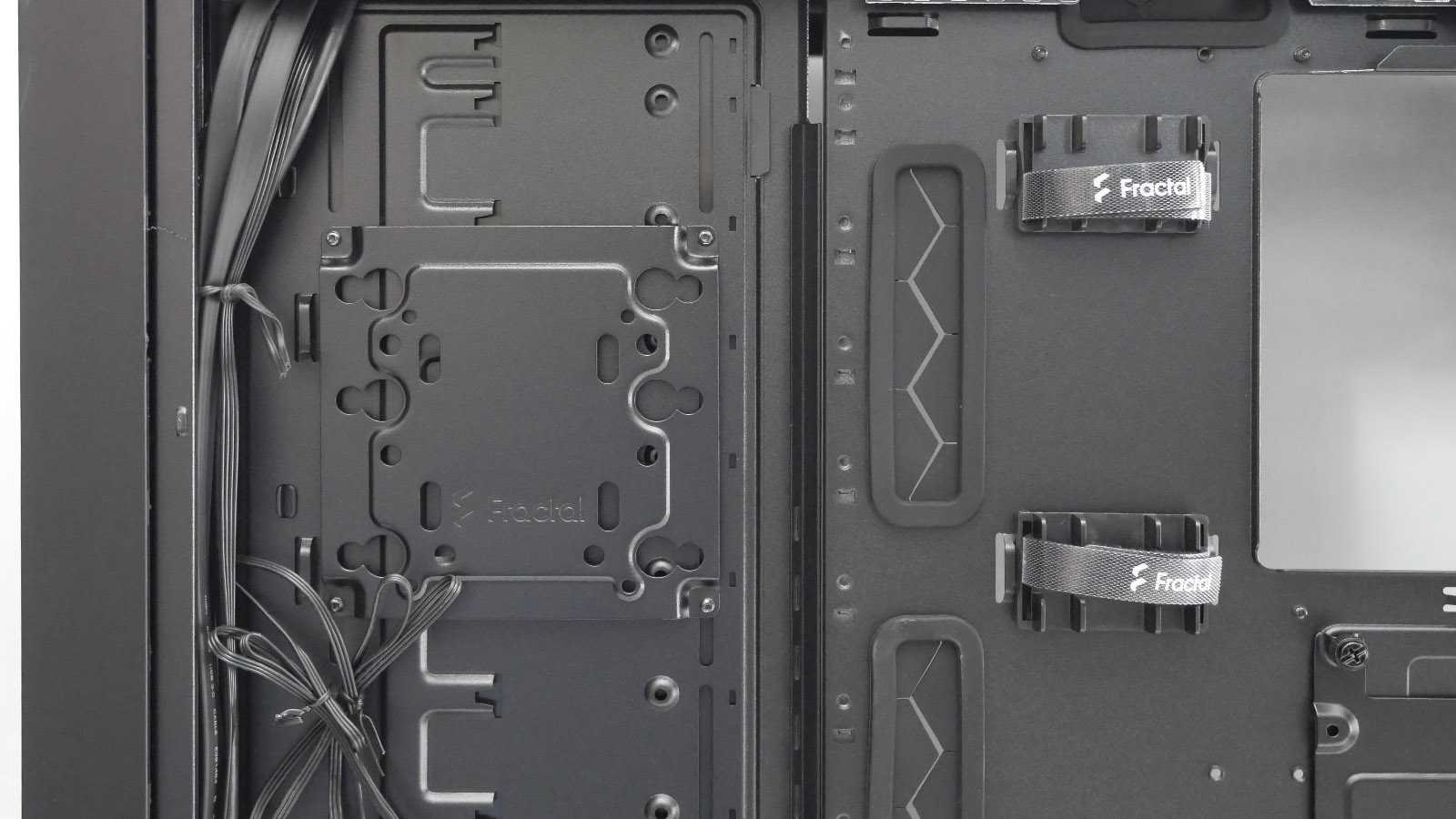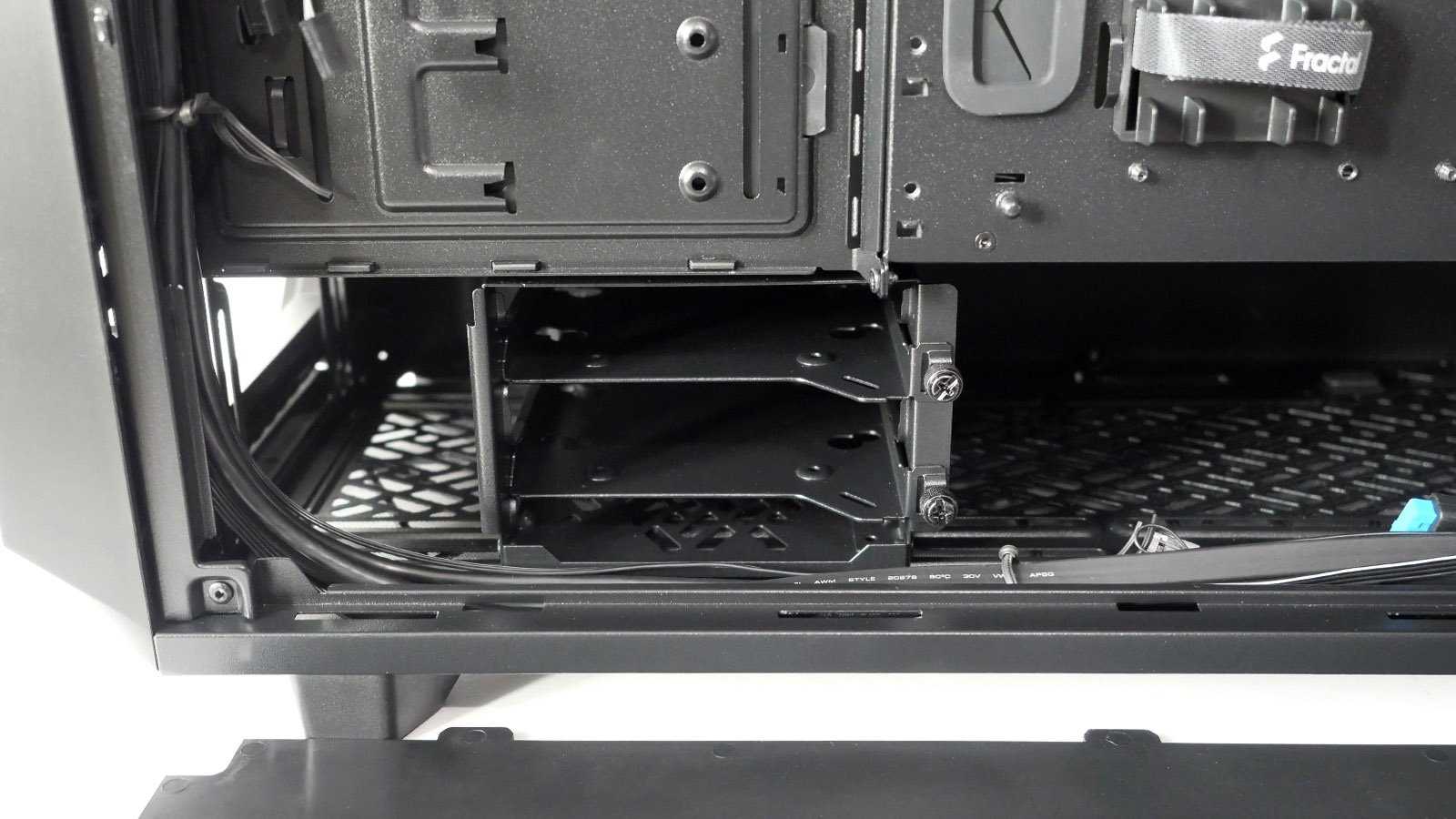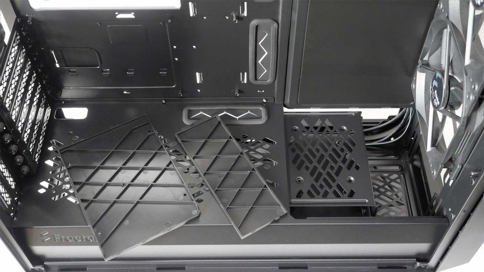Нижняя часть корпуса отделена несъёмной металлической перегородкой, обильно перфорированной стильным узором по верхней части. В ней сделаны необходимые отверстия для подведения проводов от фронтальной панели к разъёмам на материнской плате. Удлиненное окошко используется в том числе для вывода кабелей питания PCI-E и дополнительно закрыто резиновой лепестковой заглушкой. С фронтальной части перегородки около выдавленного логотипа Fractal нет вырезов, открывающих взор на блок питания, поэтому модели с интегрированной подсветкой использовать нет смысла.