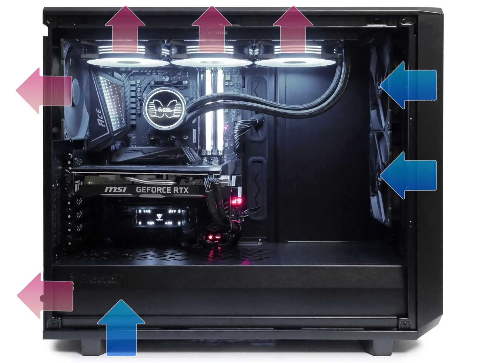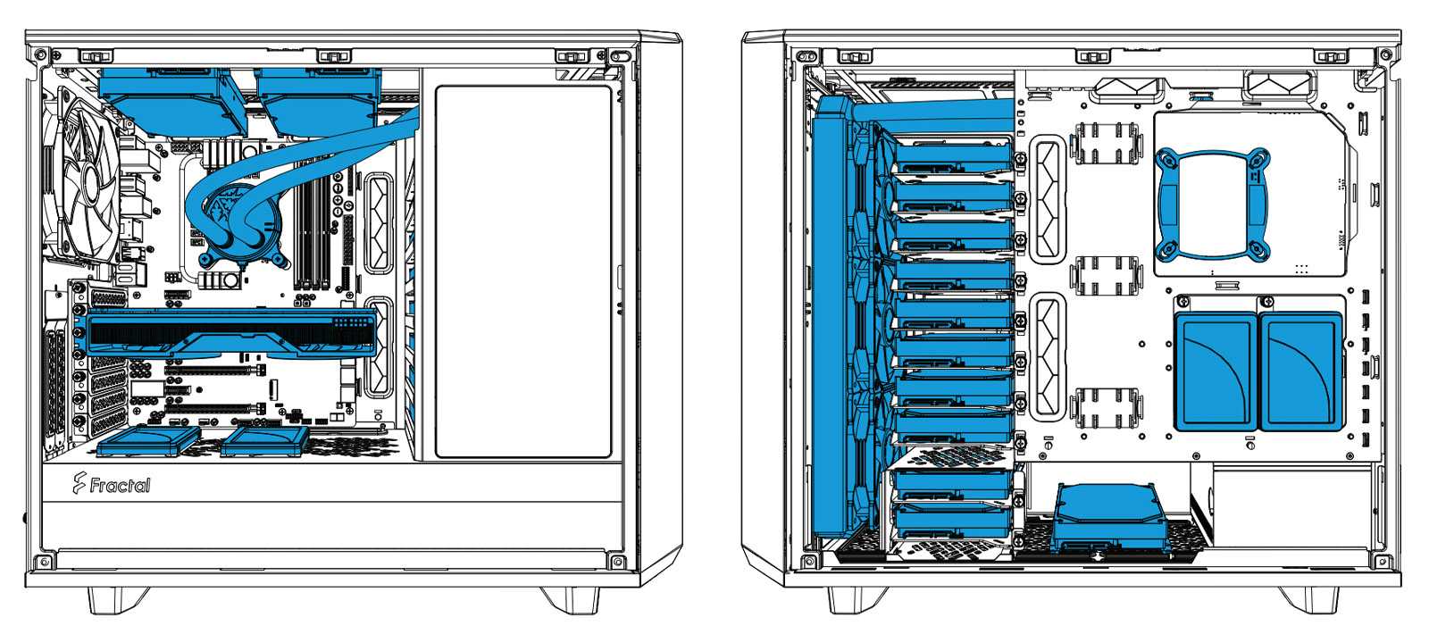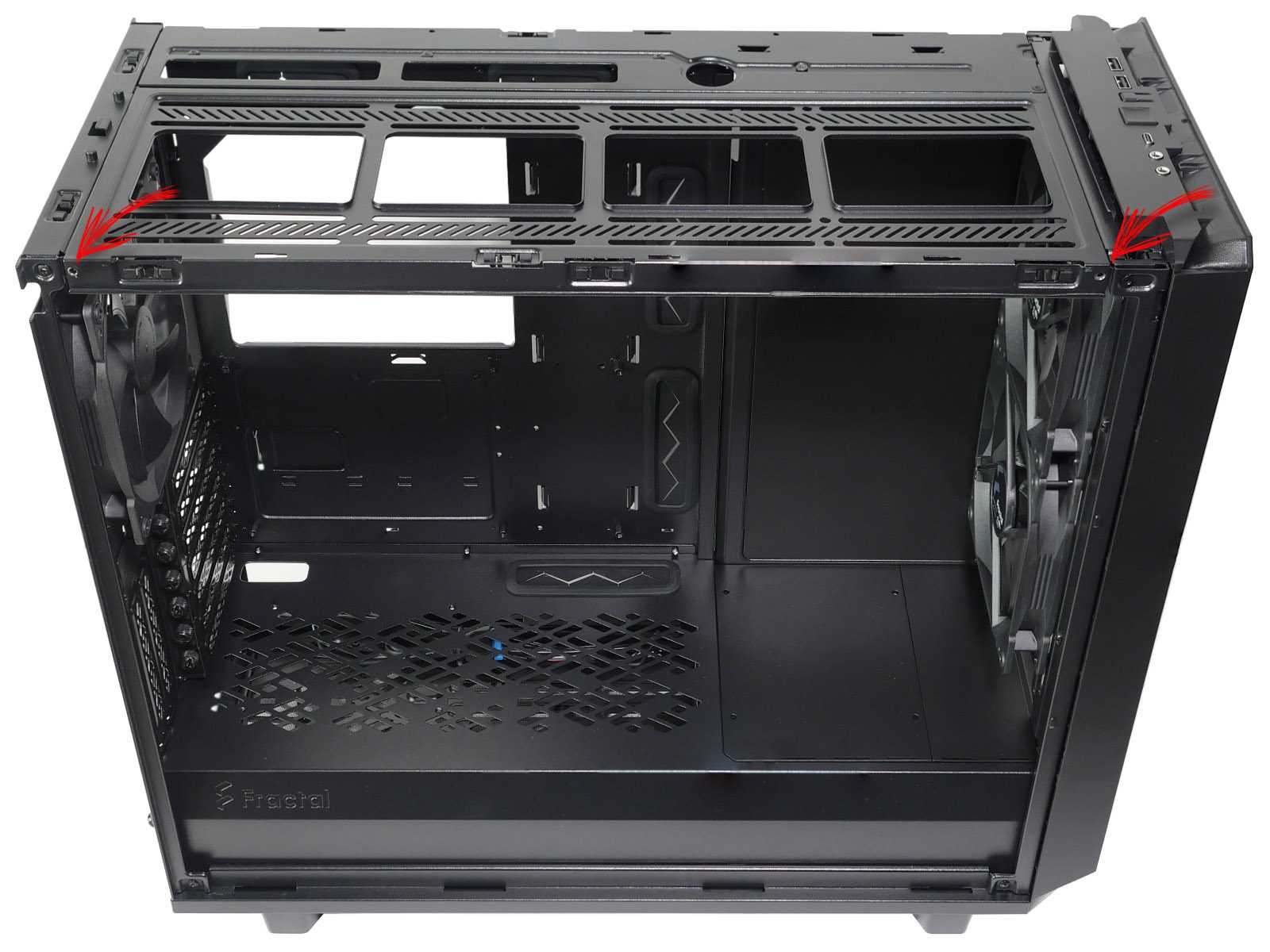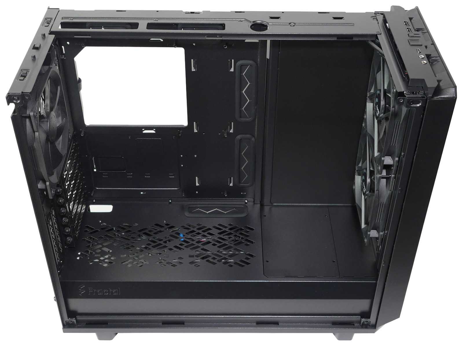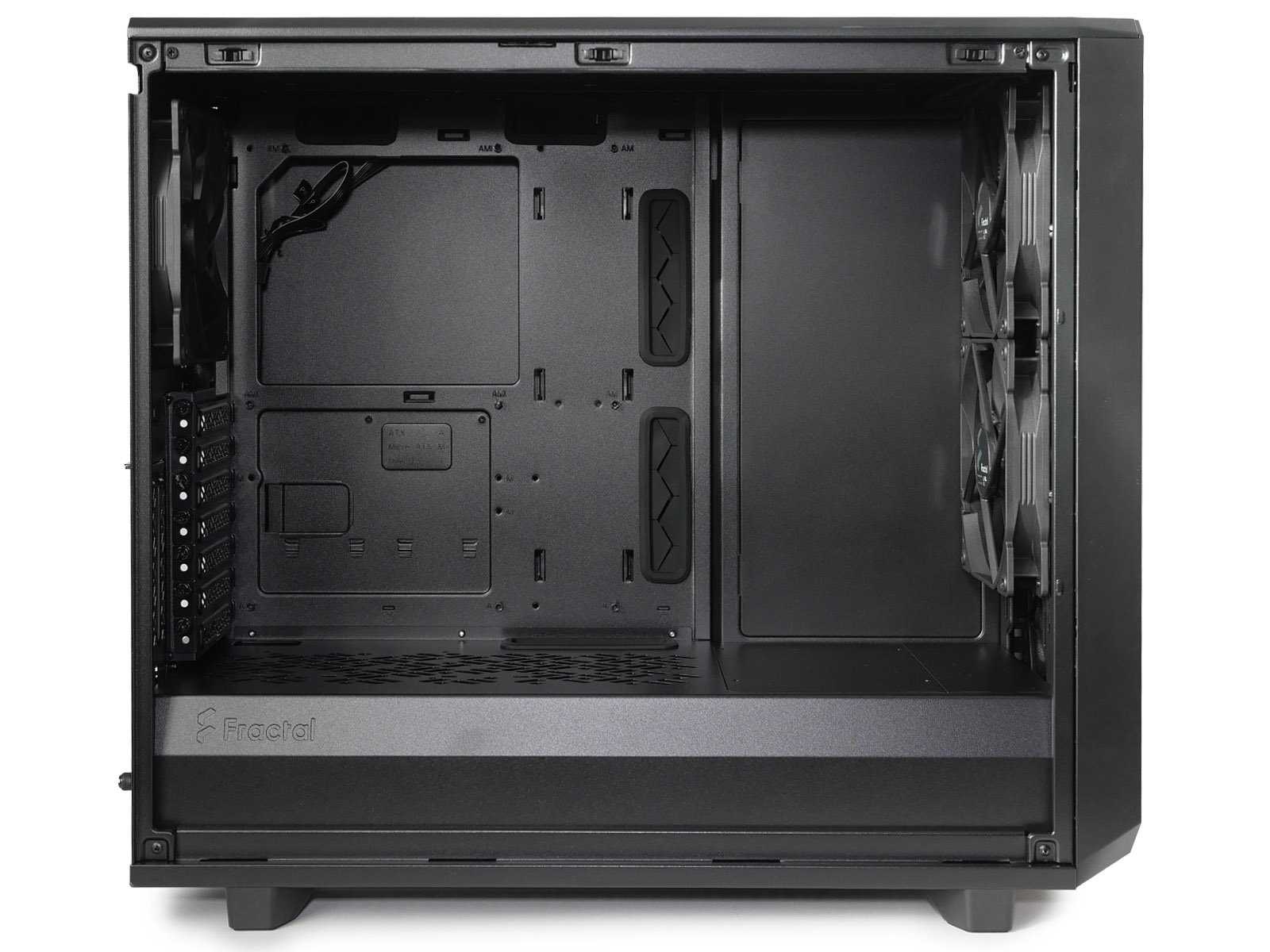 При проектировании внутреннего пространства Meshify 2 упор сделан на максимальную совместимость с высокопроизводительными комплектующими, поэтому объём основного отсека большой и без нагромождений различных корзин для устройств. Это позволило обеспечить поддержку видеокарт длиной до 49 см и суперкулеров высотой до 18,5 см.