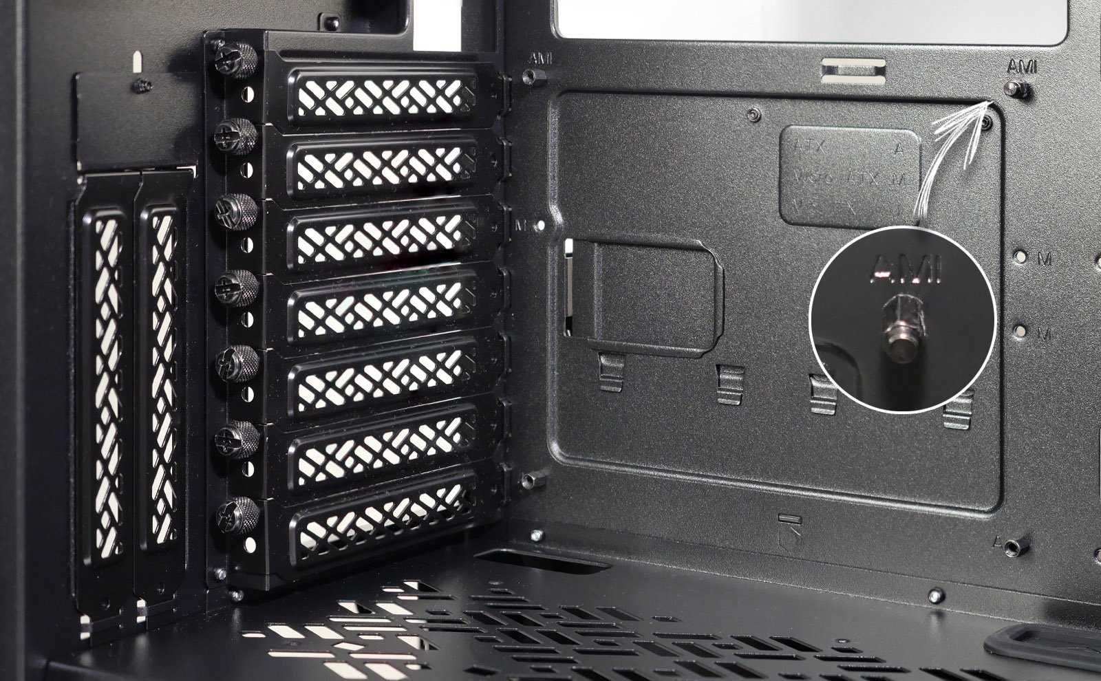 Для установки плат расширения подготовлены семь стандартных горизонтальных слотов расширения и дополнительно два вертикальных. На всех используются перфорированные многоразовые металлические съёмные заглушки с креплением винтами с накатанной головкой. На кожухе, отделяющем блок питания, подготовлены отверстия для фиксации райзера с горизонтальной печатной платой (не входит в комплект).