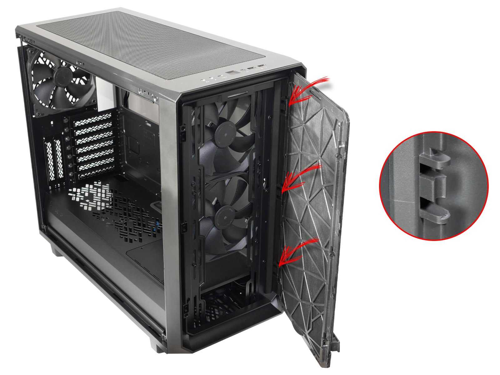 Передняя панель корпуса имеет пластиковый каркас. Её возможно снять классическим способом — рывком на себя за нижнюю часть. Однако вряд ли такая процедура потребуется, так как дизайнерская металлическая mesh-вставка одновременно является дверцей, открывающей доступ к фронтальным вентиляторам и пылевому фильтру. Роль ручки играет выступ с логотипом Fractal Design. При желании дверца снимается, так как держится на трёх пластиковых шарнирных защёлках.