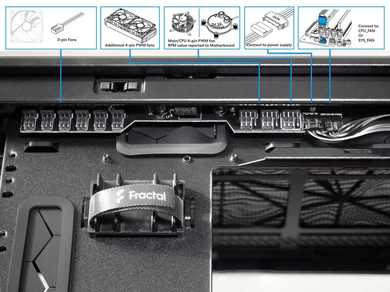 За поддоном материнской платы сверху установлен концентратор вентиляторов Fractal Design Nexus+ 2. Он запитывается отдельным SATA-коннектором напрямую от блока питания, поэтому способен обеспечить работу подключенных компонентов мощностью суммарно до 30 Вт (ток до 2,6 А при напряжении 12 В).