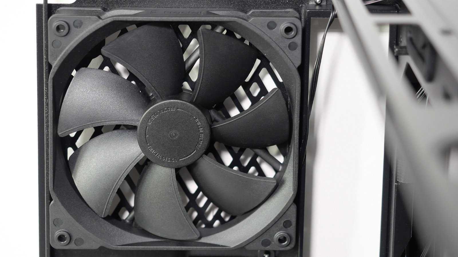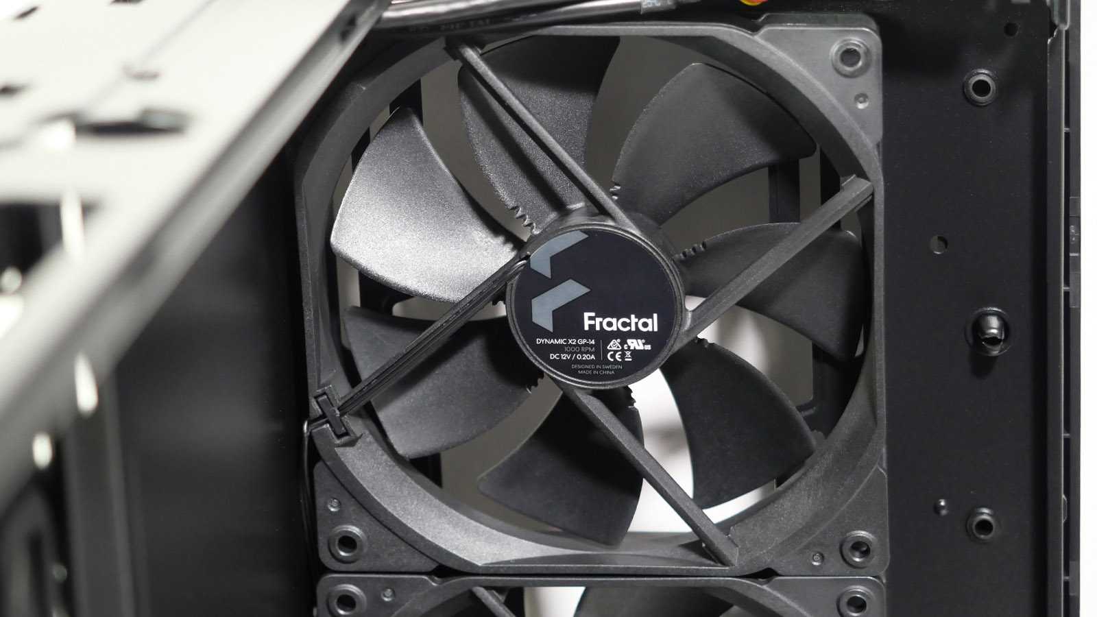 Предустановленные 140-мм вентиляторы Fractal Design Dynamic X2 GP-14 не имеют RGB-подсветки. Расстояние между крепежными отверстиями у них — 125 мм. Скорость вращения семилопастной крыльчатки достигает 1000±10% оборотов в минуту, воздушный поток — до 68.4 CFM, а создаваемое статическое давление — до 0,71 мм H2O. Стартовый порог напряжения — 4 В. Наработка на отказ заявлена на уровне 100000 часов.