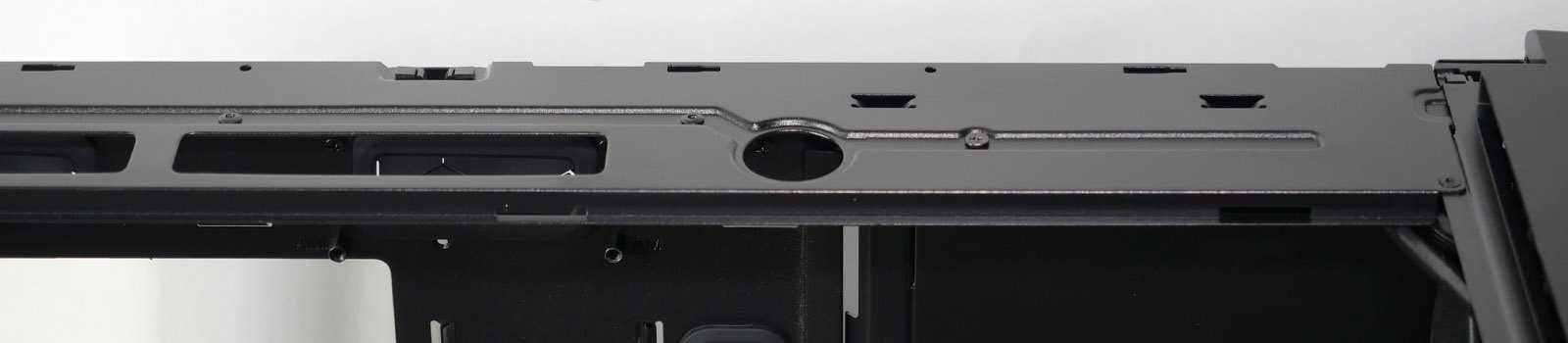 На несъёмной части каркаса сверху сделаны удобные длинные отверстия, упрощающие доступ к разъёмам по верхнему краю материнской платы, и круглый вырез диаметром 25,4 мм для филпорта кастомной системы жидкостного охлаждения.