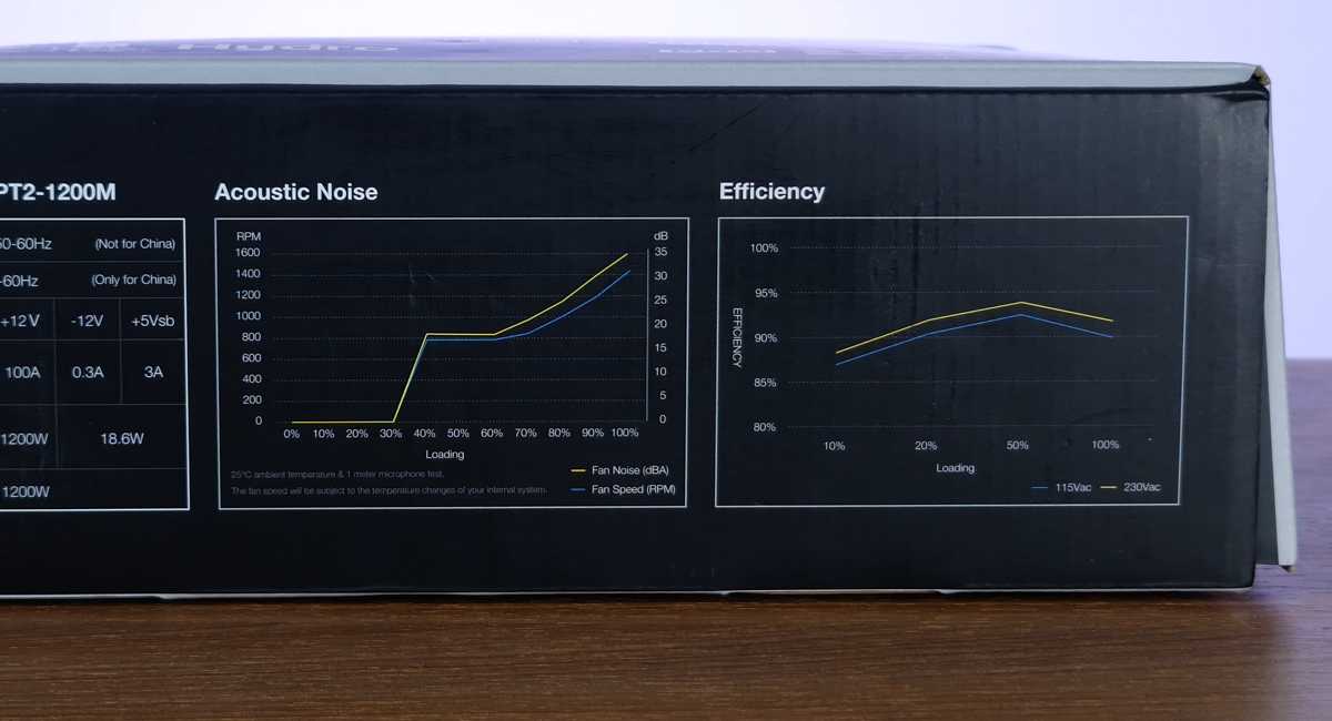 Громкость работы при нагрузке 70% и более возрастает до 37 дБа, достигая пика при перегрузке 110% с уже неприятными 48 дБа на скорости вентилятора более 2000 RPM. Что, впрочем, не мешает блоку выдерживать нагрузку 110%, или почти 1500 Вт. С эффективностью, простите, 92%.