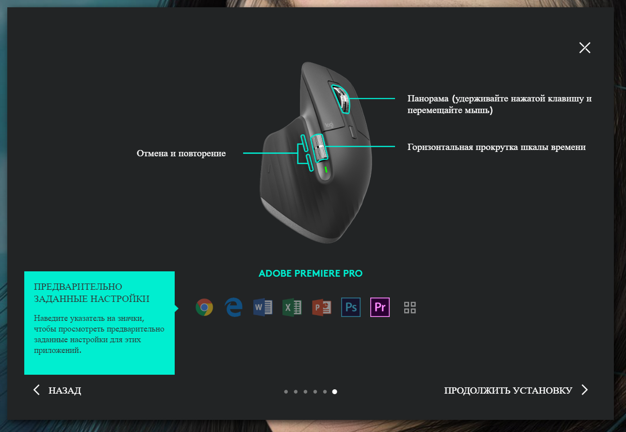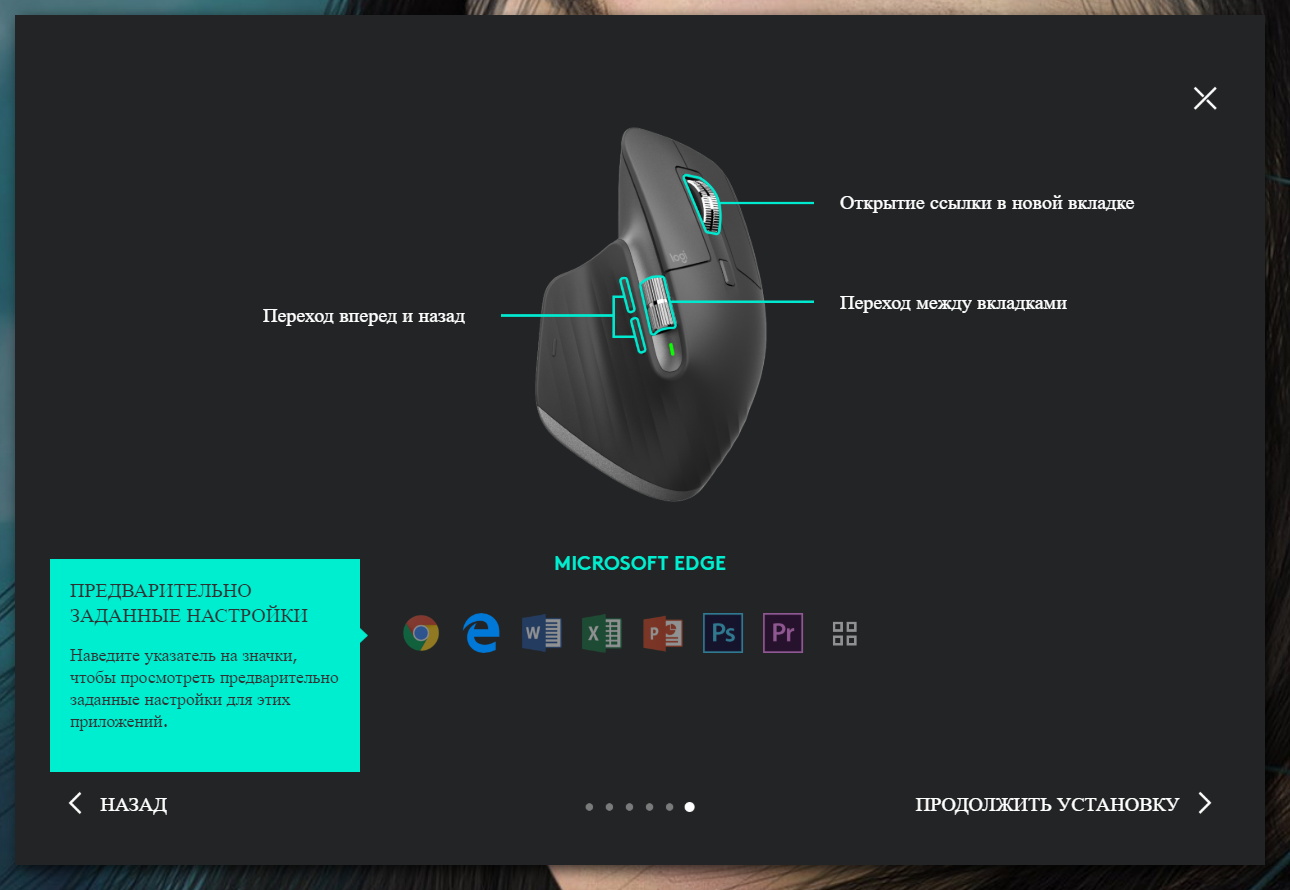 После этого вас приветствует небольшой гайд, демонстрирующий основные возможности мыши – колесика прокрутки MagSpeed, кнопки переключения режимов, кнопки жестов, колесика для большого пальца, боковых кнопок и привязки их к конкретным приложениям.