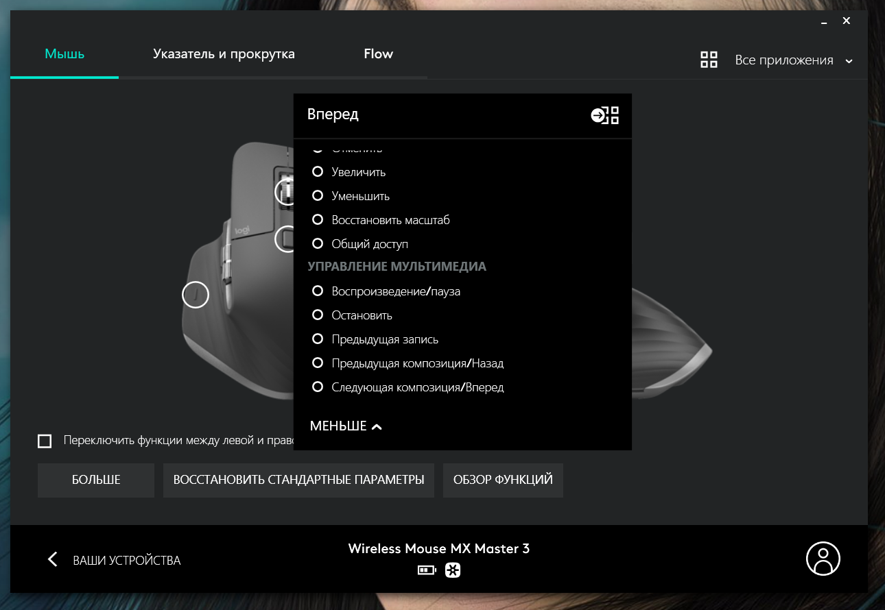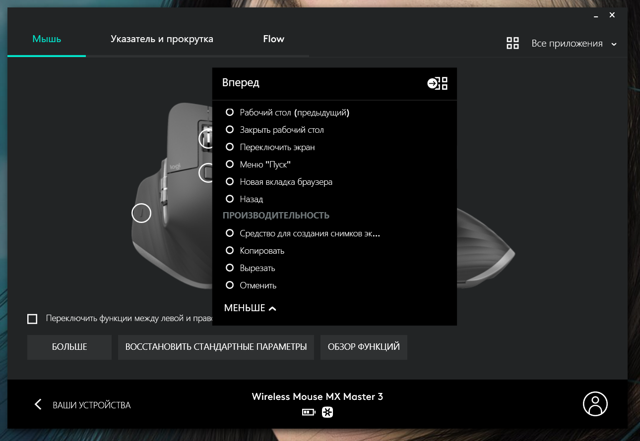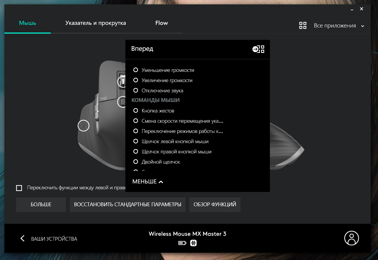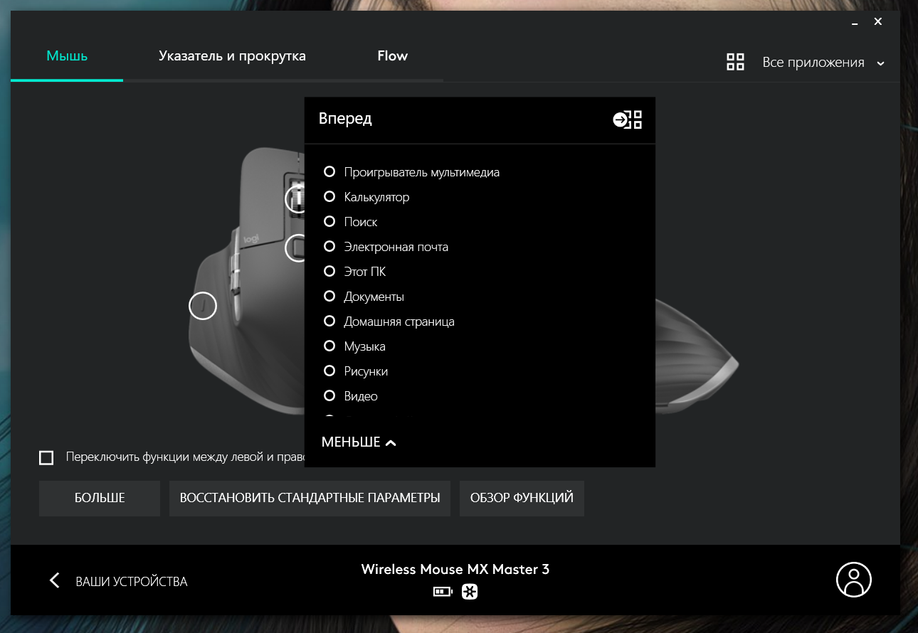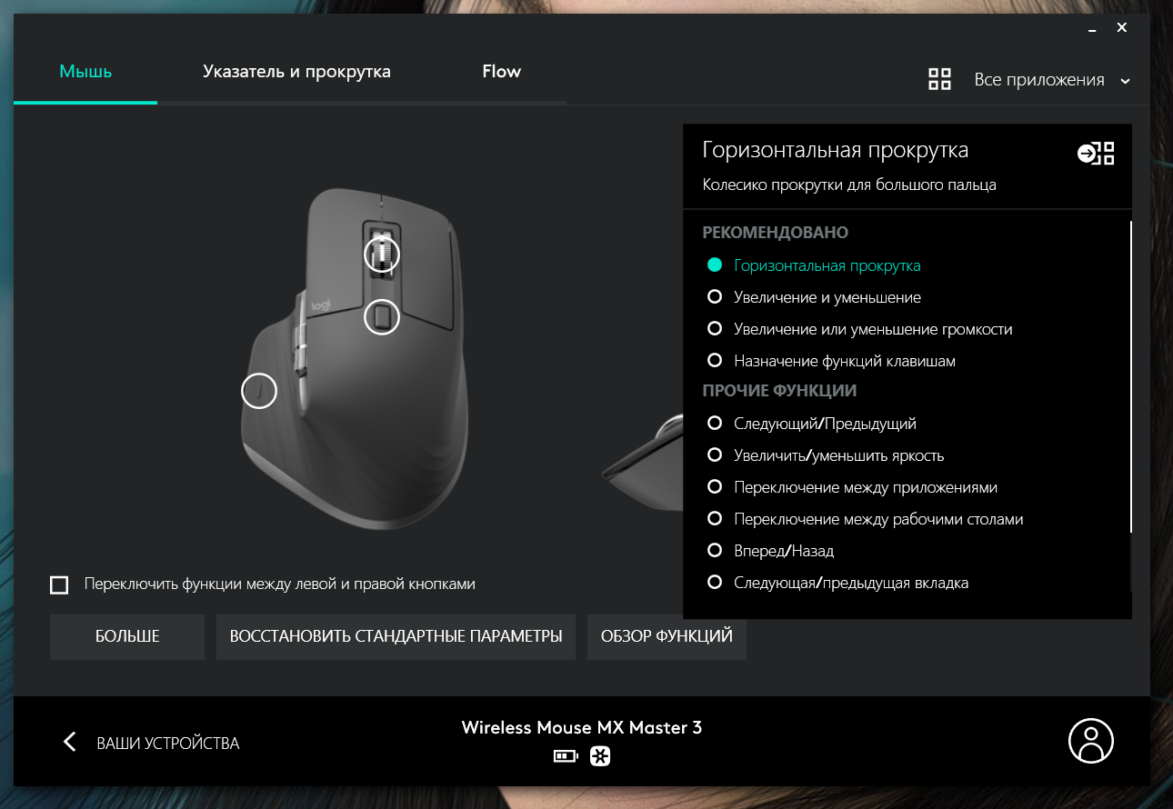 После учебника, который кстати можно пропустить, нас встречает основное окно программы Logitech Options, в котором путем простого клика на одной из кнопок или колесиков, можно задать им желаемую функцию.