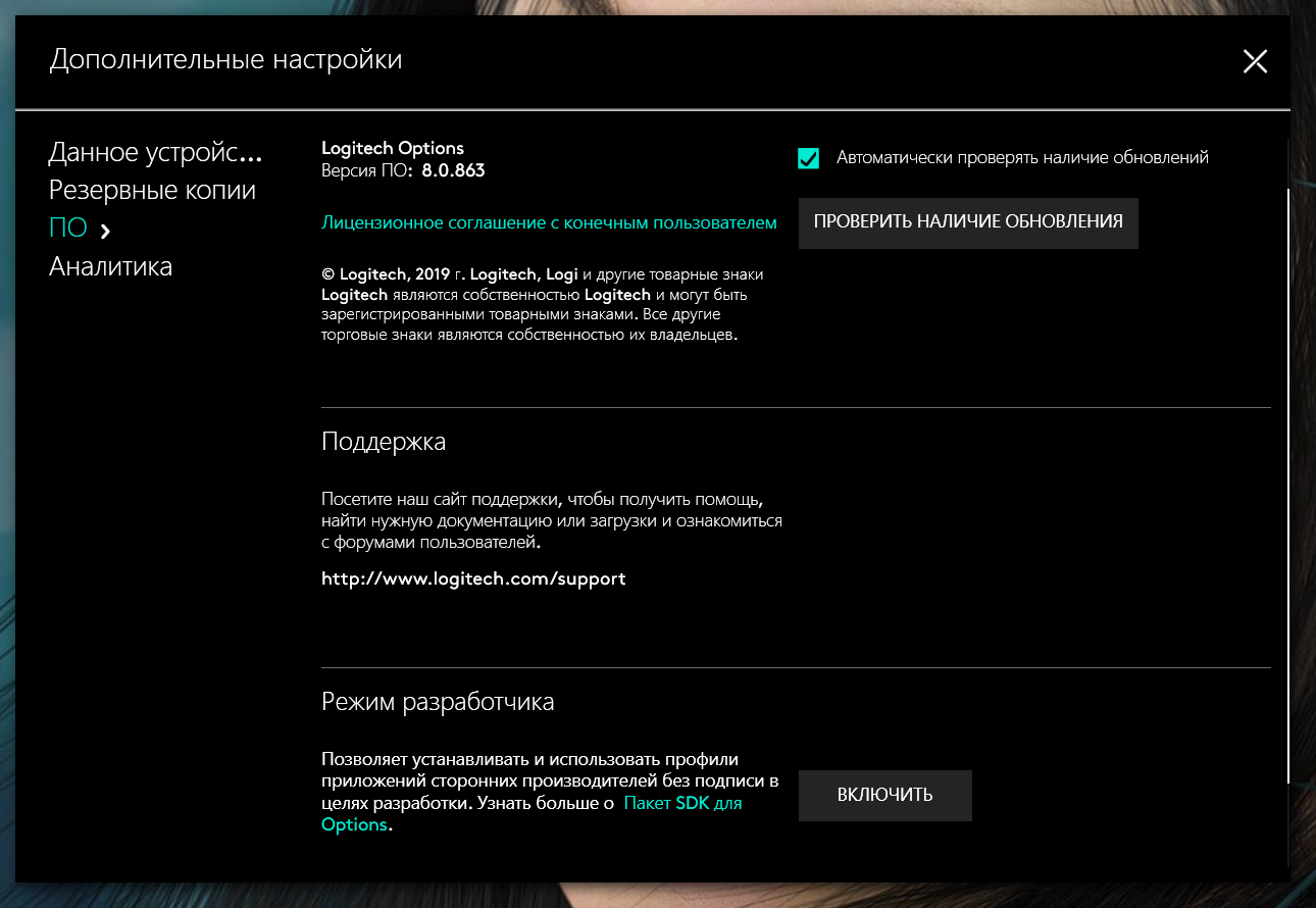 Ну и последнее, это раздел «Дополнительные настройки», доступный по кнопке «Больше» в главном окне программы (на вкладках «Мышь» и «Указатель и прокрутка») в Logitech Options.