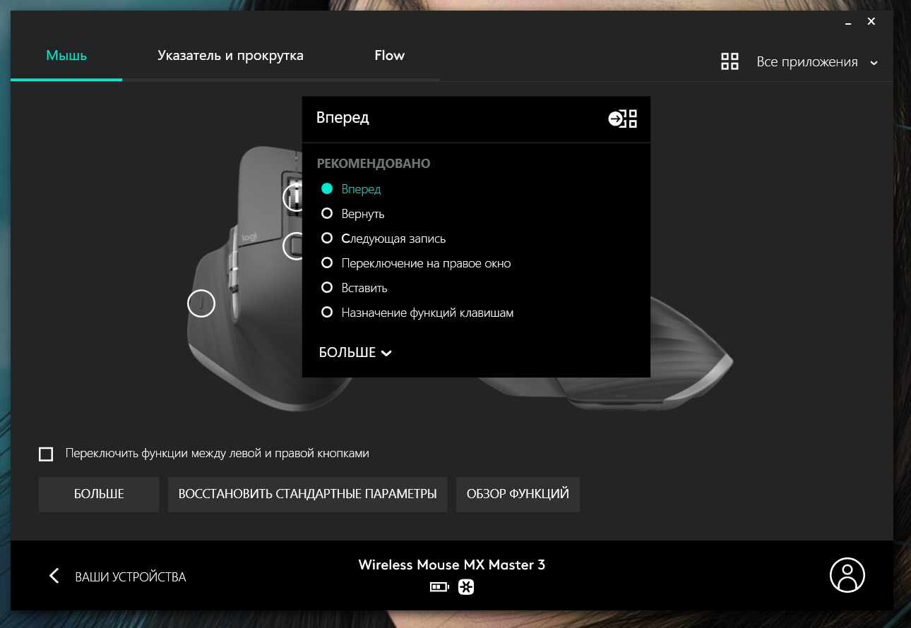 И именно мышка Logitech MX Master 3 мне здесь поможет, так как у неё имеется второе колесо, без которого заниматься графическим дизайном очень скучно. Однако прежде всего для правильной работы всех органов управления нужно установить фирменные драйвера, в процессе установки можно настроить действия кнопок для различных приложений. В Windows 10 процесс установки драйверов будет запущен автоматически при подключении мышки.