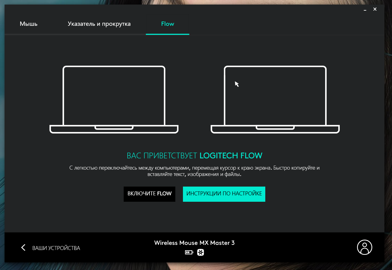 Дальше идет крайне интересная вкладка «Flow», на которой можно настроить одновременной использование мышки на нескольких разных компьютерах и ноутбуках. Вы можете переносить курсор мыши с экрана одного ПК на другой так, как будто у вас просто подключено несколько мониторов к одному компу. Также можно копировать текст и файлы между компьютерами.