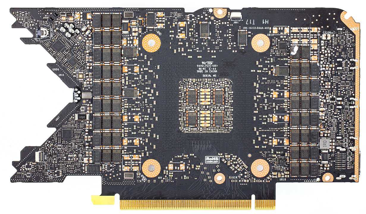 Подсистема питания видеопроцессора насчитывает 16 фаз. Элементов оказалось так много, что их пришлось разделить на две части. Первые 12 фаз находятся справа от видеоядра, а остальные 4 фазы, совмещённые с другими четырьмя фазами питания видеопамяти, находятся слева от чипа GA102.