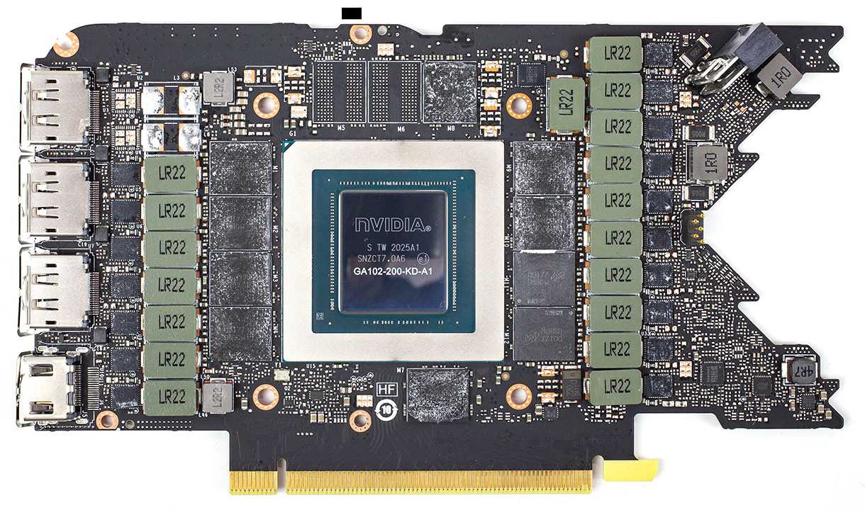 Для заряженного поколения старших графических процессоров RTX 30 на архитектуре NVIDIA Ampere выдвигаются повышенные требования к качеству регуляторов напряжения самого чипа и видеопамяти, увеличив число мосфетов до 18 по формуле «15+3» (GPU/Mem), управляемые ШИМ-контроллерами Monolithic Power Systems MP2884B, MP2886B и MP2888B.