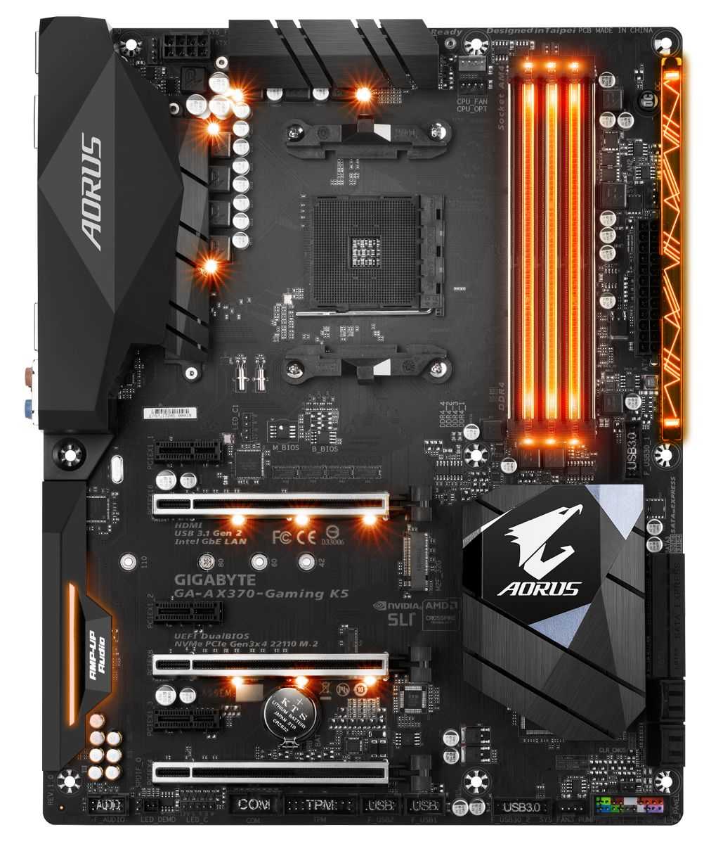 Gigabyte Aorus GA-AX370-Gaming 5 базируется на наборе микросхем AMD X370, оснащена процессорным гнездом Socket AM4 и предназначается для установки процессоров серии Ryzen от компании AMD. Данный процессор может взаимодействовать исключительно с оперативной памятью DDR4, поэтому старый стандарт (DDR3) больше не поддерживается. Помимо уже упомянутых портов USB 3, данная материнская плата предлагает еще и 4 порта USB 2.0 (внутренние), которые можно использовать, например, для подключения устройств ввода.