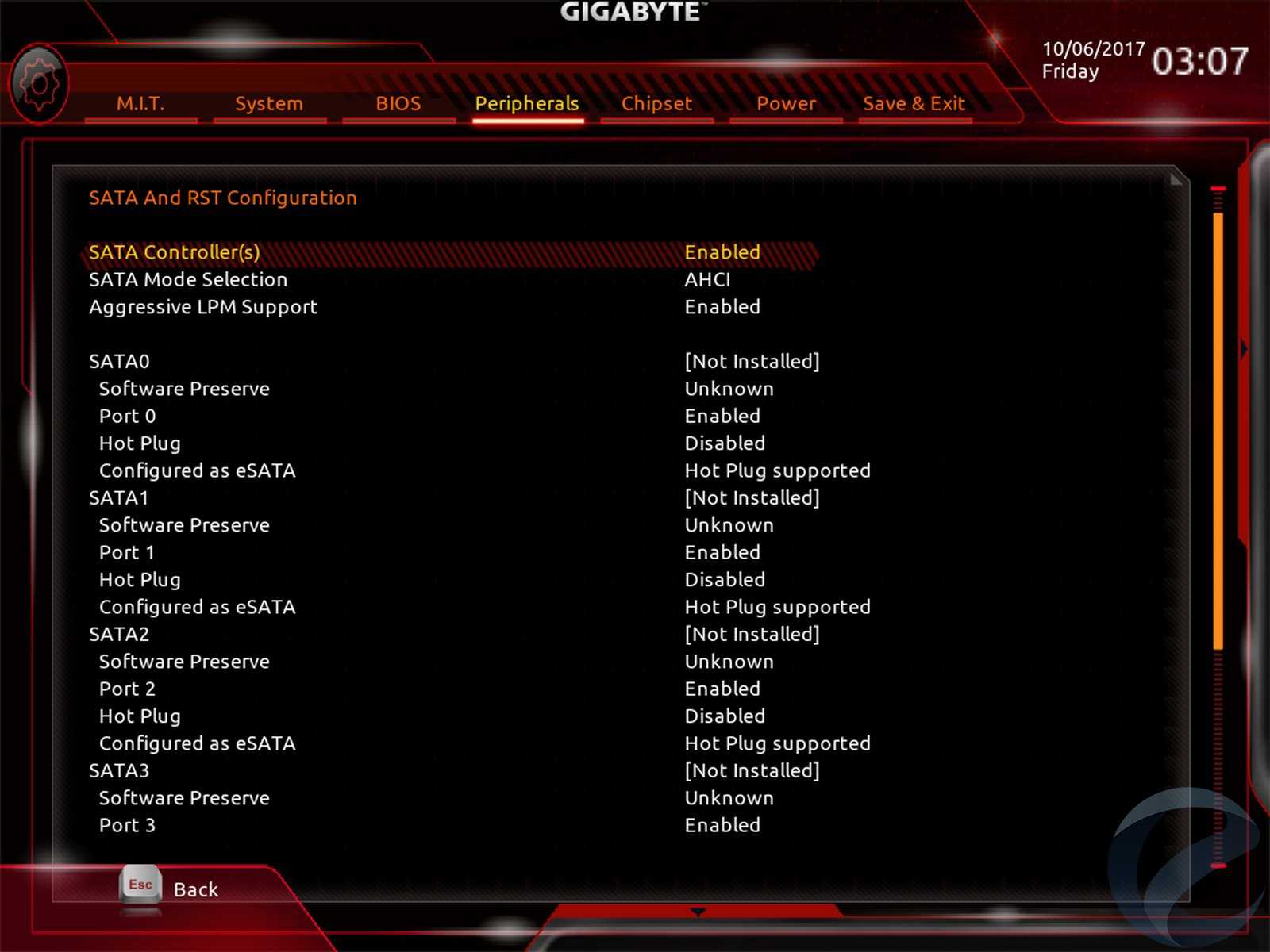 Вкладка «Peripherals», как подсказывает ее название, отвечает за настройки по периферийным устройствам платы. Здесь пользователь может настроить работу USB и SATA-портов, а также отрегулировать фирменную подсветку материнской платы.
