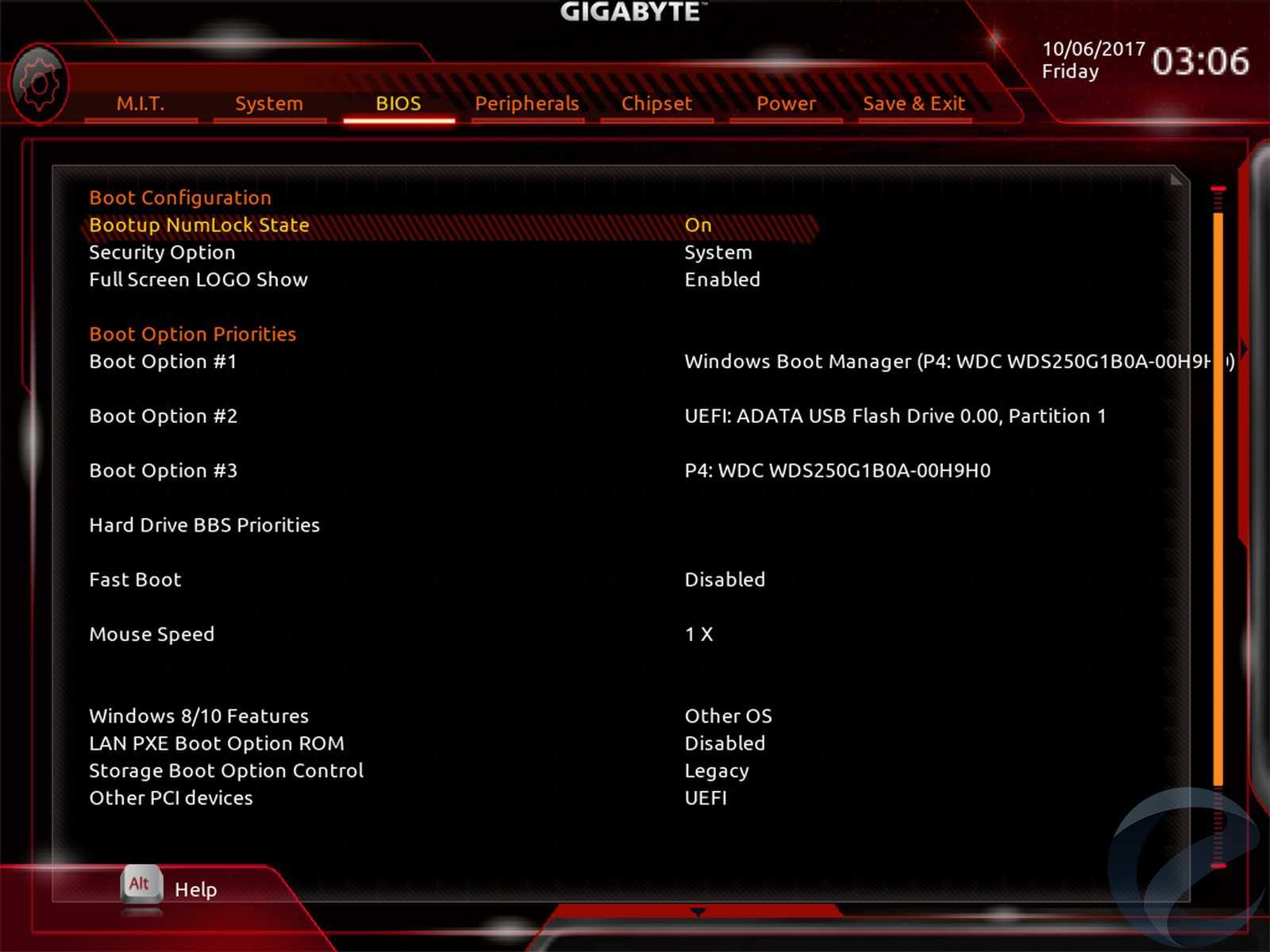 Раздел «BIOS» содержит настройки по приоритету загрузочных накопителей, активацию логотипа при старте системы, установку пароля на сам BIOS, а также регулировку чувствительности мыши.