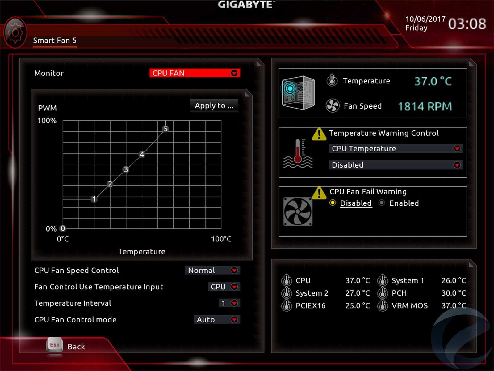 А вторая — это вкладка «Smart Fan 5», где можно настроить алгоритм работы вентиляторов, подключенных к материнской плате. При этом тюнинг доступен как в автоматическом режиме, так и ручном — с использованием графика кривой зависимости температуры от скорости вращения вентиляторов.