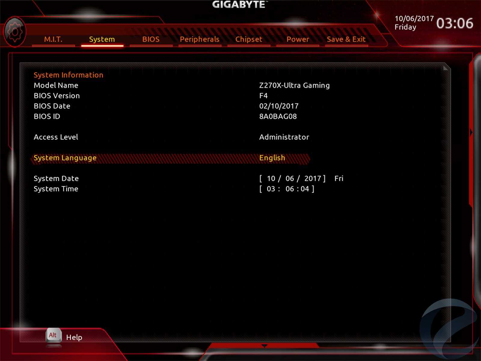 Следующая вкладка «System» включает в себя наименование модели платы, версию прошивки BIOS, текущую дату и время, а также язык интерфейса.