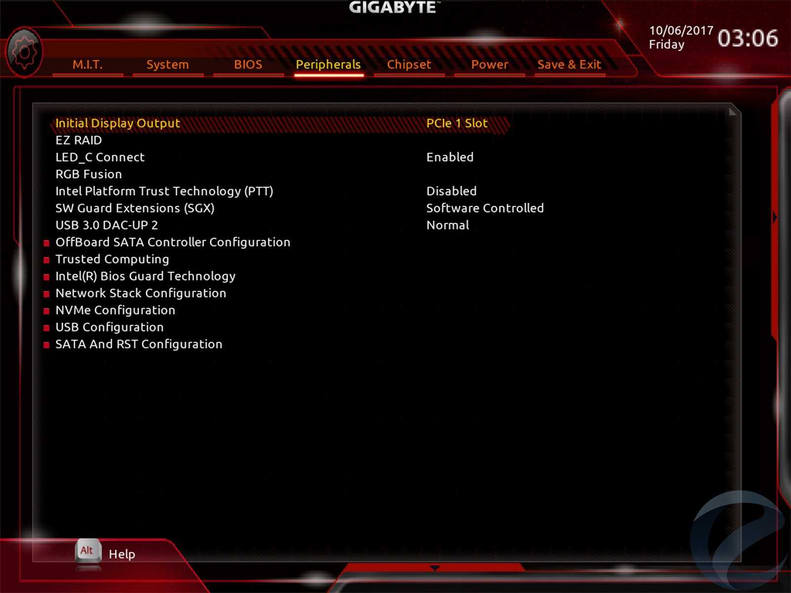 Что касается полного перечня настроек платы AORUS GA-Z270X-Gaming K5, то они представлены в классическом режиме доступа к BIOS. Здесь все структурировано в виде тематических разделов, самым богатым на разгон и тонкий тюнинг системы является вкладка «M.I.T». Здесь можно найти опции по разгону процессора, оперативной памяти и ее таймингов, регулировке напряжений, а также настройке работы вентиляторов и их мониторинга.