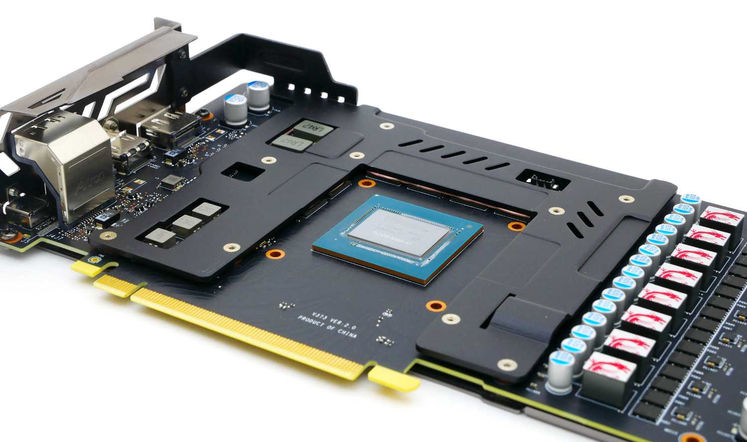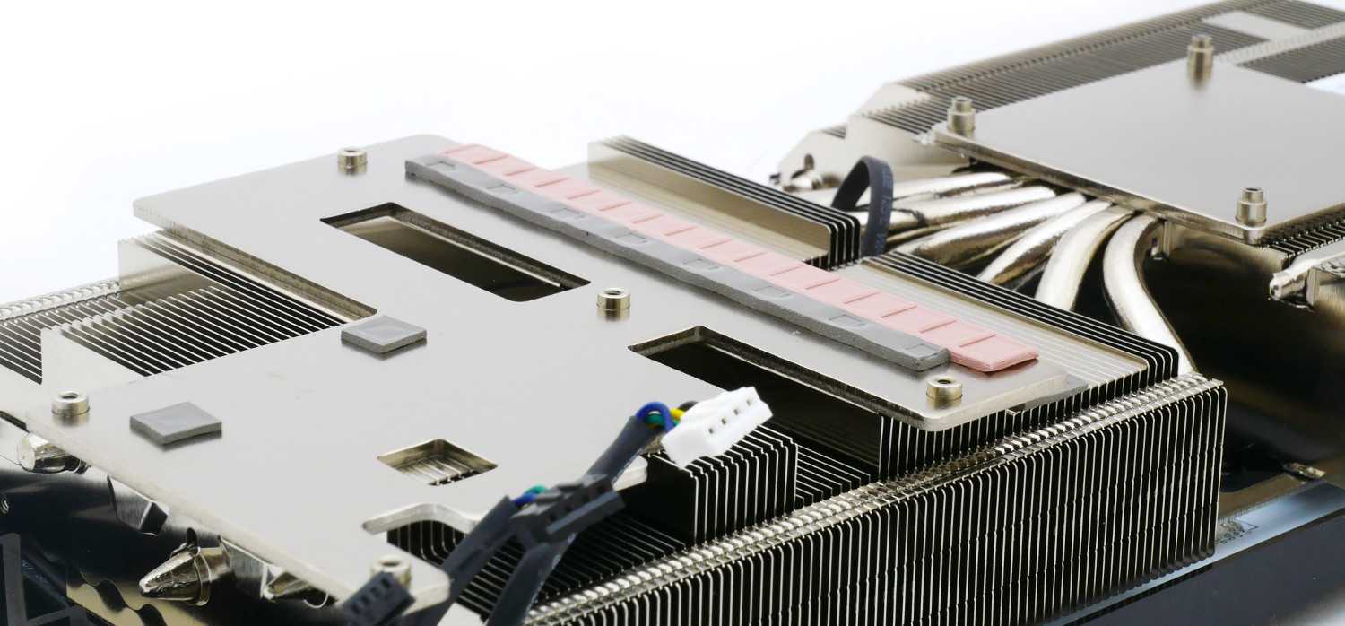 Микросхемы видеопамяти и две фазы питания vMem охлаждаются отдельной планкой, плавно перетекающей в элемент жесткости и фиксируемой к задней планке.