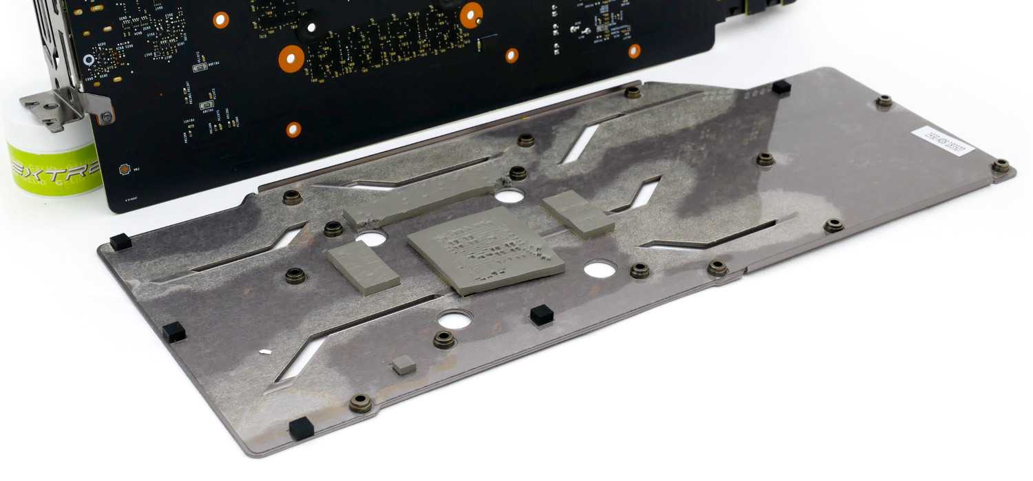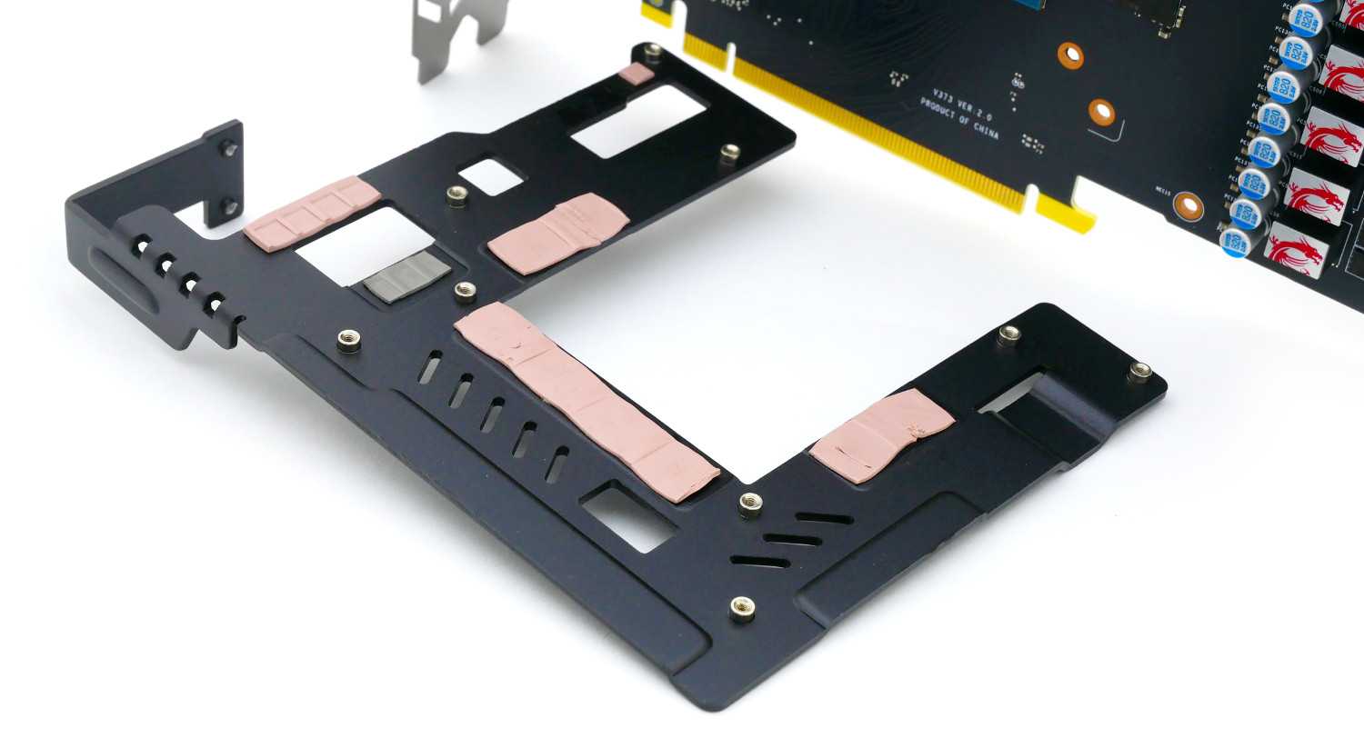 Очередным трендом двадцатой серии GeForce RTX стало использование бэкплейта в роли пассивного теплоотвода, и производитель никак не мог упустить шанс сделать систему охлаждения еще эффективнее.