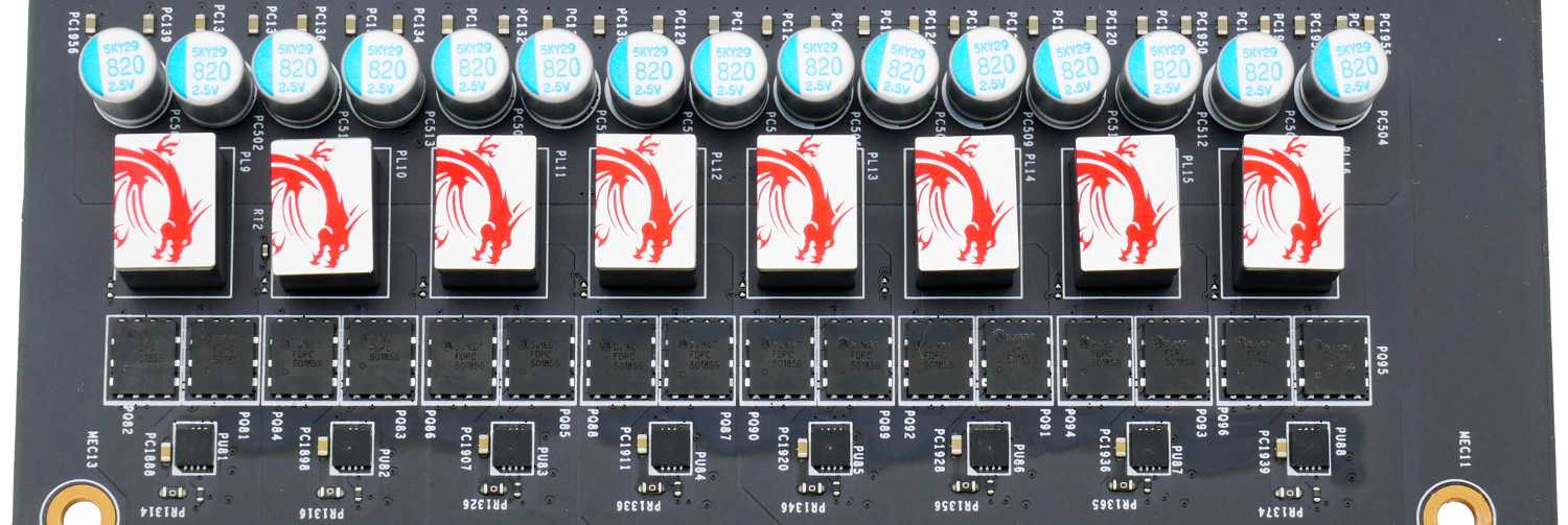 Модель MSI GeForce RTX 2070 Gaming Z 8G оснащена десятифазной системой питания, где восемь фаз отведены на графический процессор и две — на видеопамять. За управление фазами GPU отвечает ШИМ-контроллер uP9512P. Кроме этого, разработчики установили предохранители, задача которых предотвратить повреждение силовой части от перегрузок.