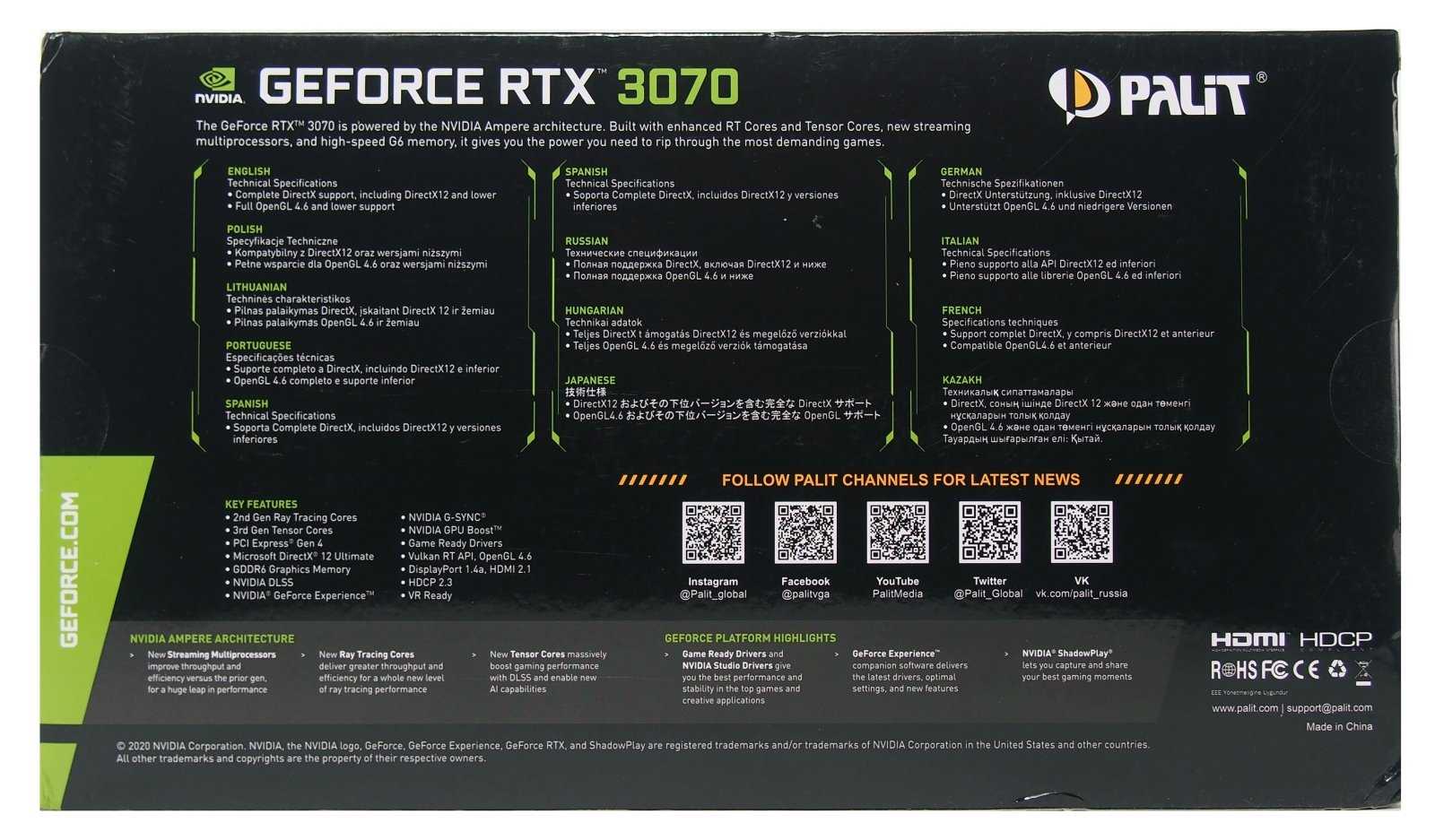 Немного информации про архитектуру NVIDIA Ampere находится на тыльной стороне коробки. Основной акцент делается на обновленные тензорные и RT-ядра, позволяющие достичь нового уровня производительности в современных играх.