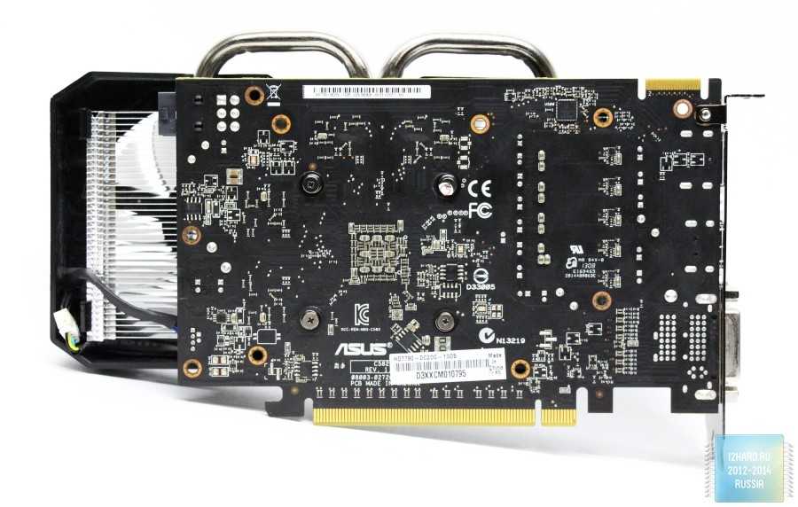 Принципиально ASUS Radeon HD7790 построена на открытой системе охлаждения. То есть видеокарта не имеет никакого кожуха, благодаря чему воздух, нагнетаемый системой охлаждения, соударяясь о плату, выходит с разных сторон. Данный метод охлаждения хорош тем, что на самой плате не создается эффект печки, наоборот, вместе с радиатором охлаждения обдуваются и остальные элементы платы. Длина самой печатной платы видеокарты составляет 177 мм.