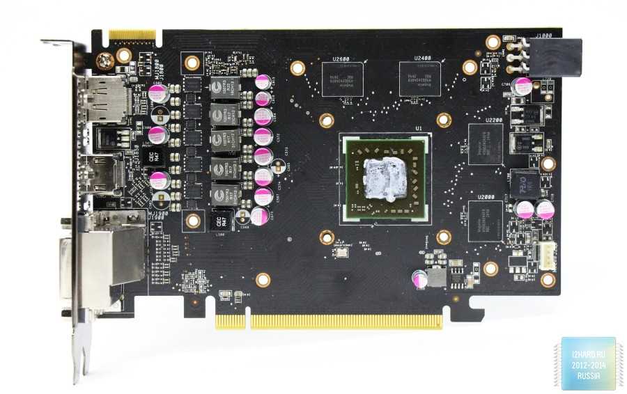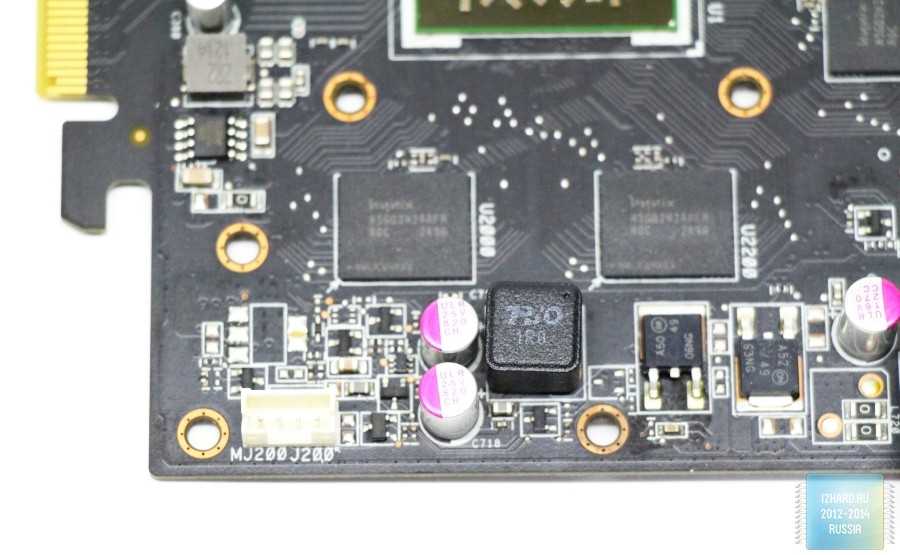 Вокруг GPU размещены микросхемы памяти с маркировкой H5GQ2H24AFR производства Hynix. Общий объем памяти в 1Gb набран четырьмя микросхемами объемом по 256Mb каждая.