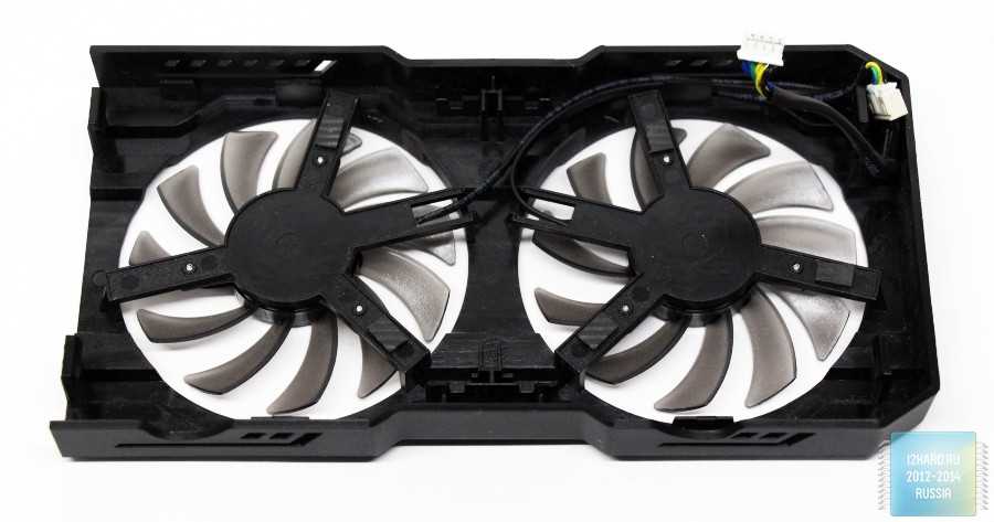 Сверху радиатор системы охлаждения накрывает пластиковая рамка, на которой закреплены два 75 мм вентилятора, которая крепится к радиатору с помощью защелок.