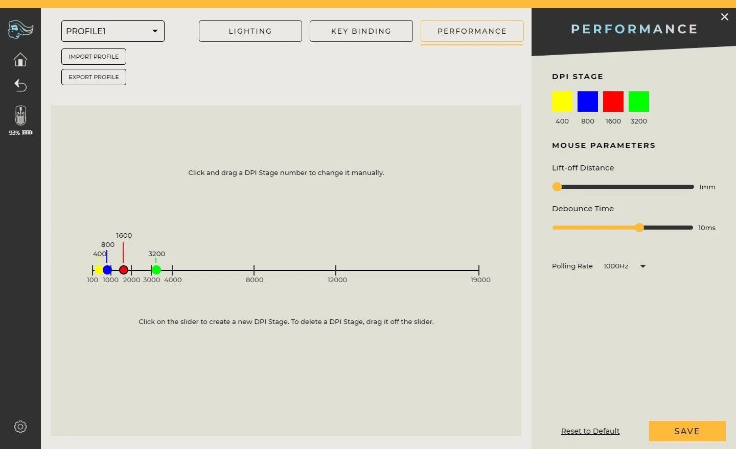 The performance tab houses all the settings for CPI, lift off distance, debounce time and polling rate.
