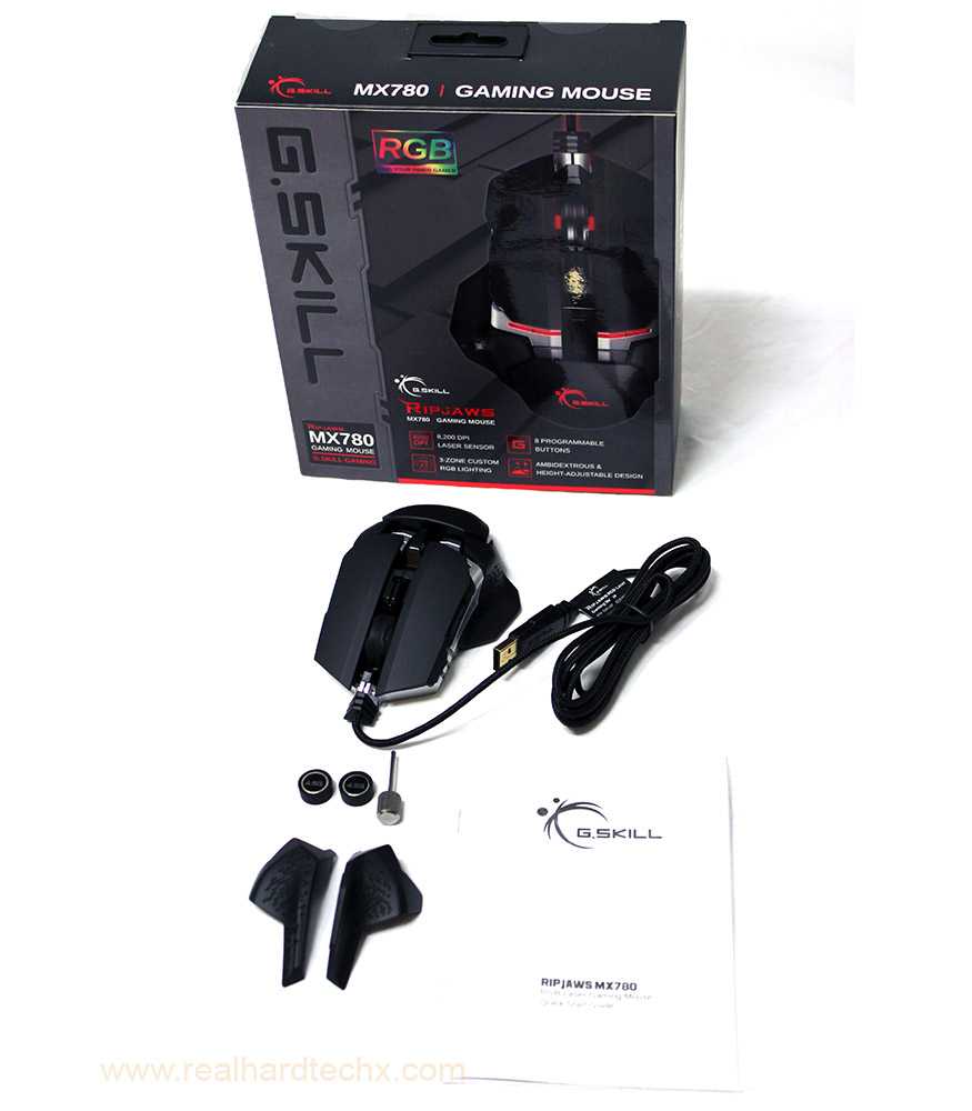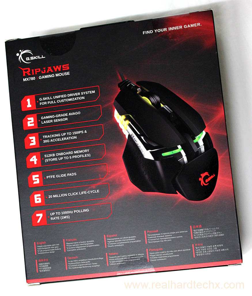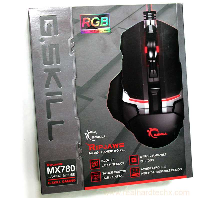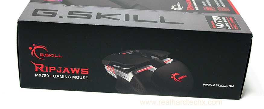 The left of the package is taken up with the G.SKILL and Ripjaws MX780 naming on what appears to be a memory heat spreader. To the right we find the LEDs are full RGB, we see a large image of the mouse, and at the bottom, the DPI and sensor, the custom RGB lighting, the eight buttons, and its ambidextrous and height adjustable design.