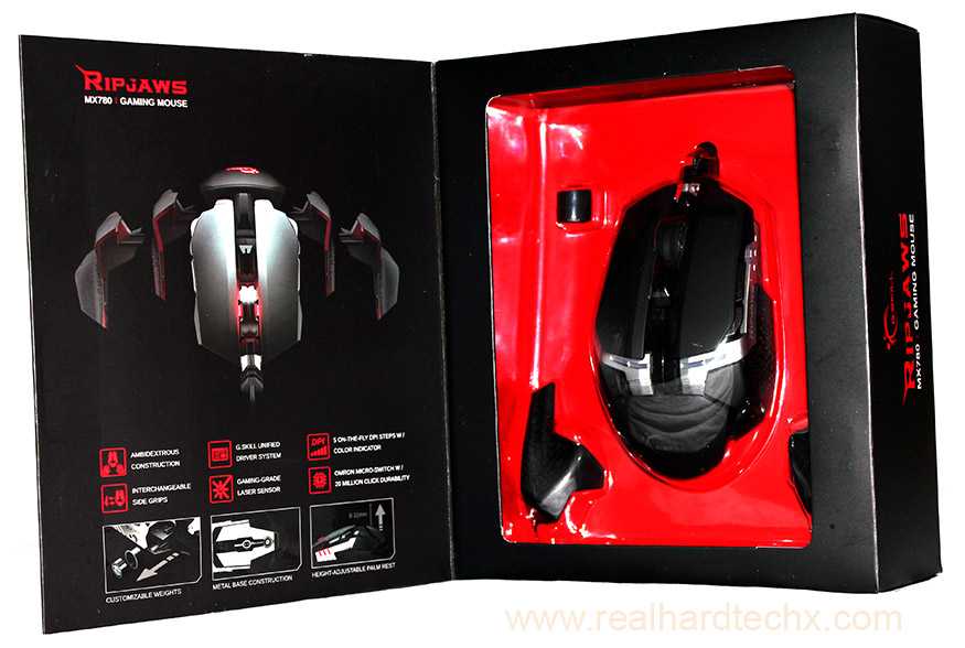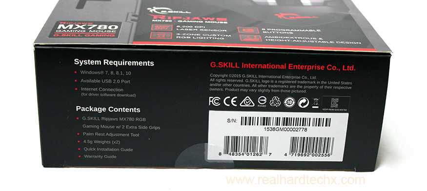 En la portada, además de la foto del Ripjaws MX780, G.Skill ha destacado los 8200DPI del sensor laser ajustable, los 8 botones totalmente programables, las 4 zonas de retroiluminación programables y los asideros laterales intercambiables y la pieza de la palma regulable en altura.
