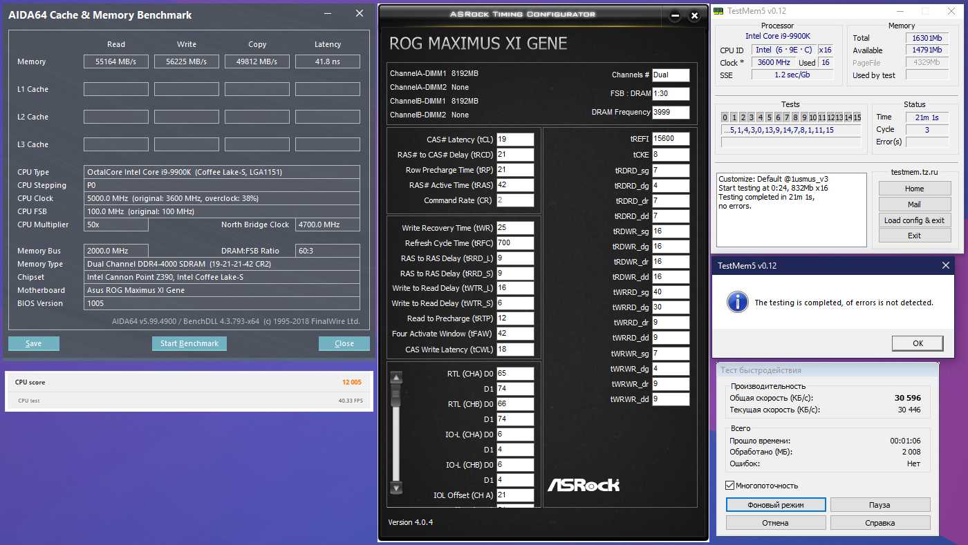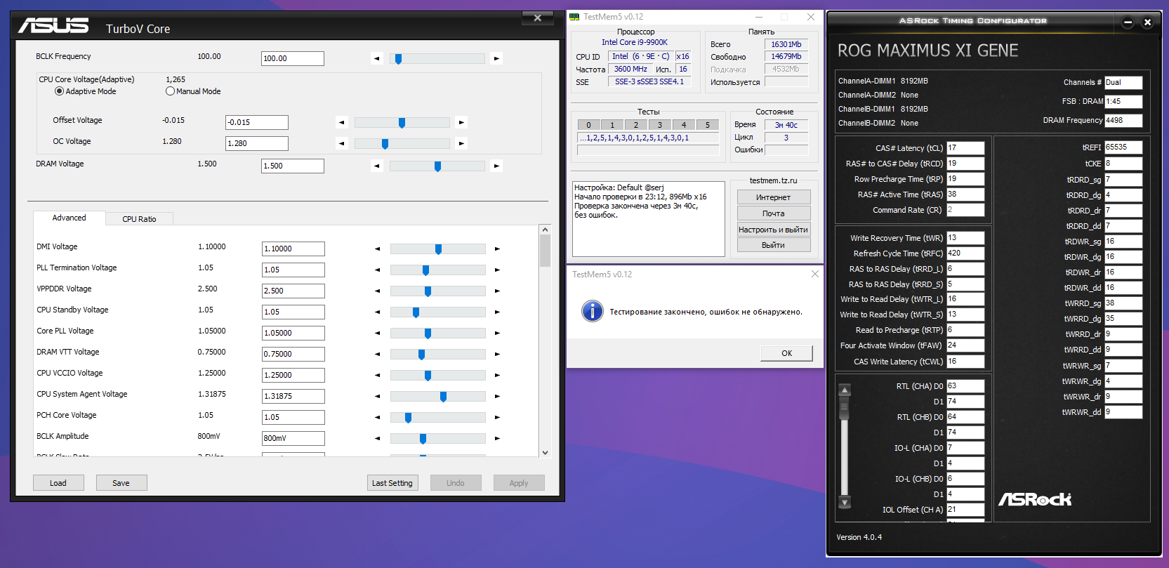 В итоге нам удалось достичь стабильного прохождения теста без ошибок на частоте 4500 МГц с установленным напряжение 1.5 В с таймингами 17-19-19-38.
