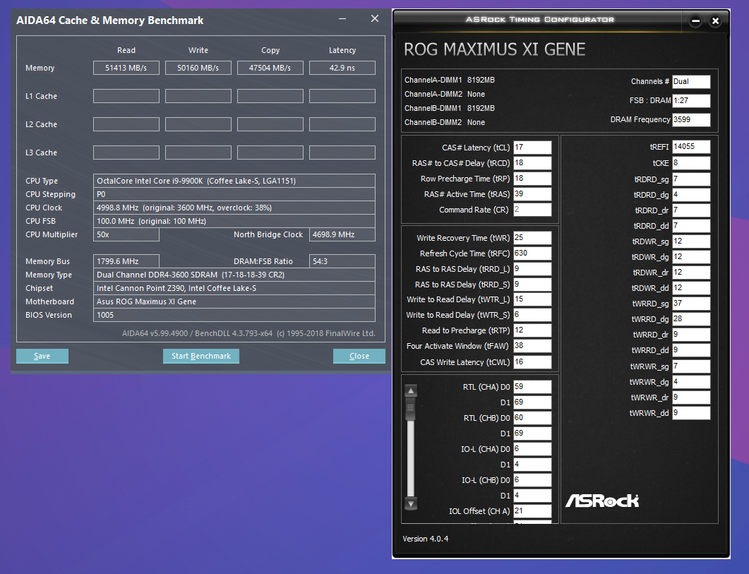 - Процессор: Intel Core i9-9900K в разгоне всех ядер до 5000 МГц при напряжении 1.22 В (частота кольцевой шины 4700 МГц);