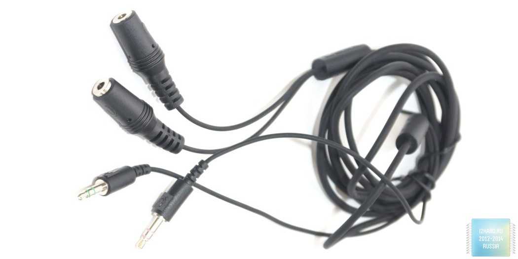 Кабель к чашкам крепится с двух сторон, не очень популярное решение, чаще встречается крепление к одной чашке. Зато так надежнее, нет лишней разводки проводов через дужку. Кабель разделяется на два штекера. Каждый штекер промаркирован и плюс на каждом присутствуют прокладки зеленого и оранжевого цветов. Это для точного определения. Основной кабель короткий — 1,2 м и дополнительный удлинитель на 1,8 м. Такая система удобнее, чем один длинный кабель, если подключаете к переднему разъему корпуса, то лишняя длина не будет мешаться.