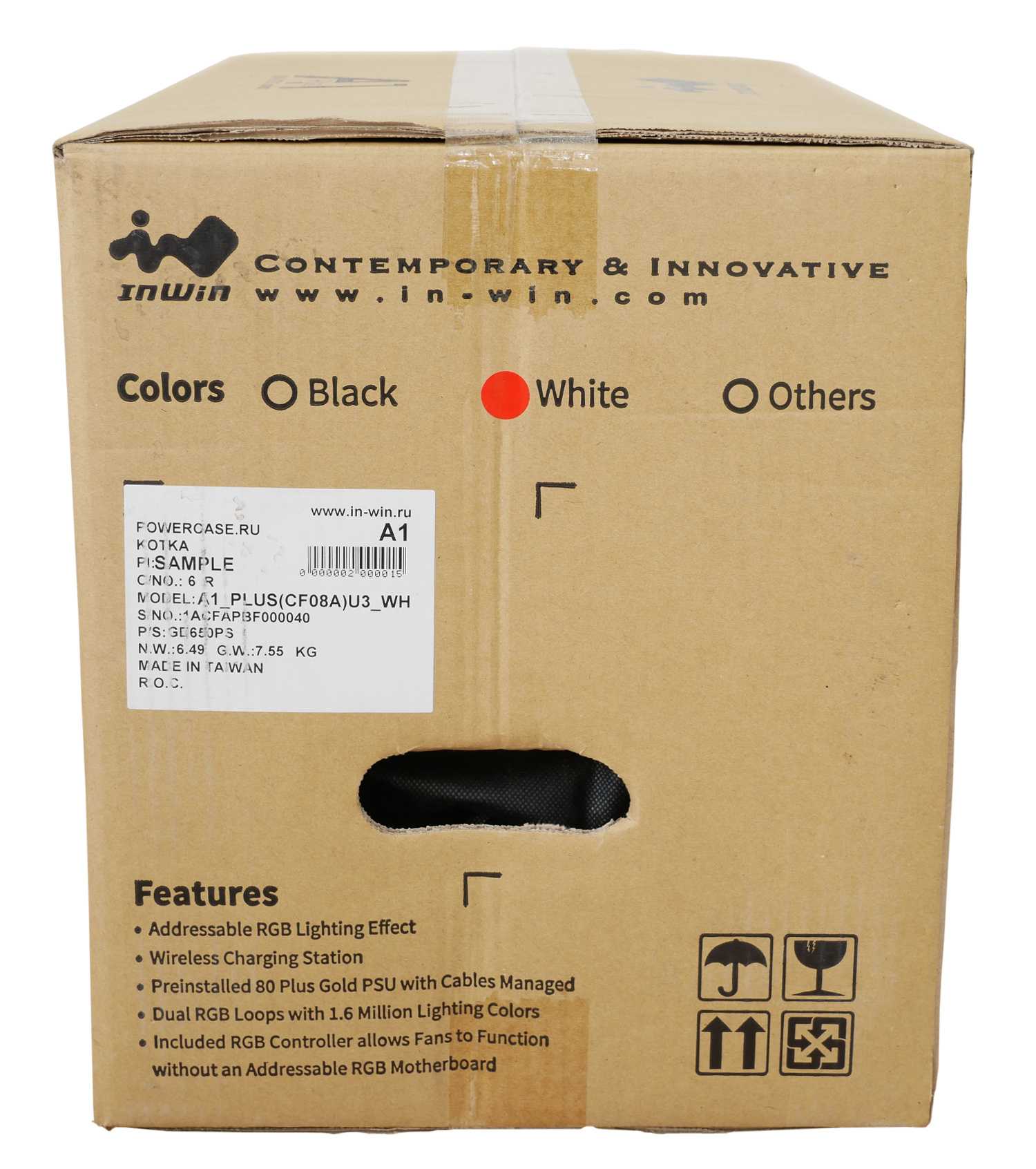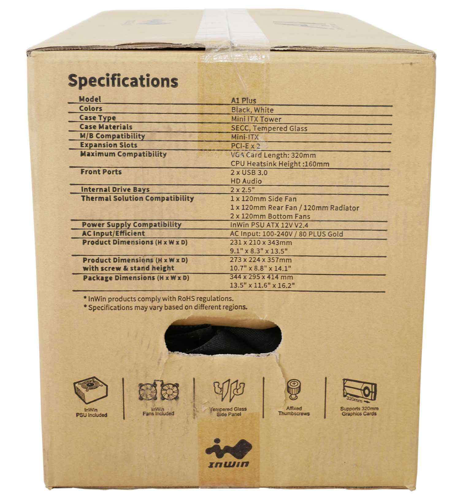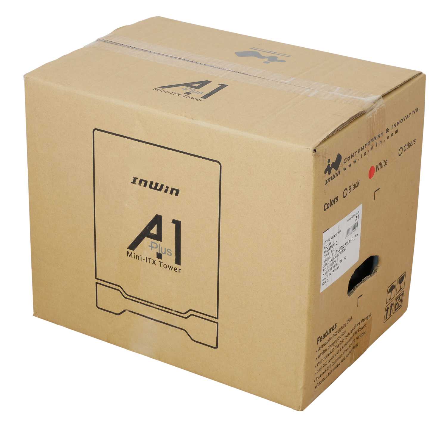 На торцах располагается спецификация корпуса, выделенная в отдельной таблице с техническими характеристиками. Отдельный пункт информирует о комплекте поставки. Модель InWin A1 Plus поставляется в классическом черном варианте и изысканном белом; также недавно производитель анонсировал версию в розовых тонах.