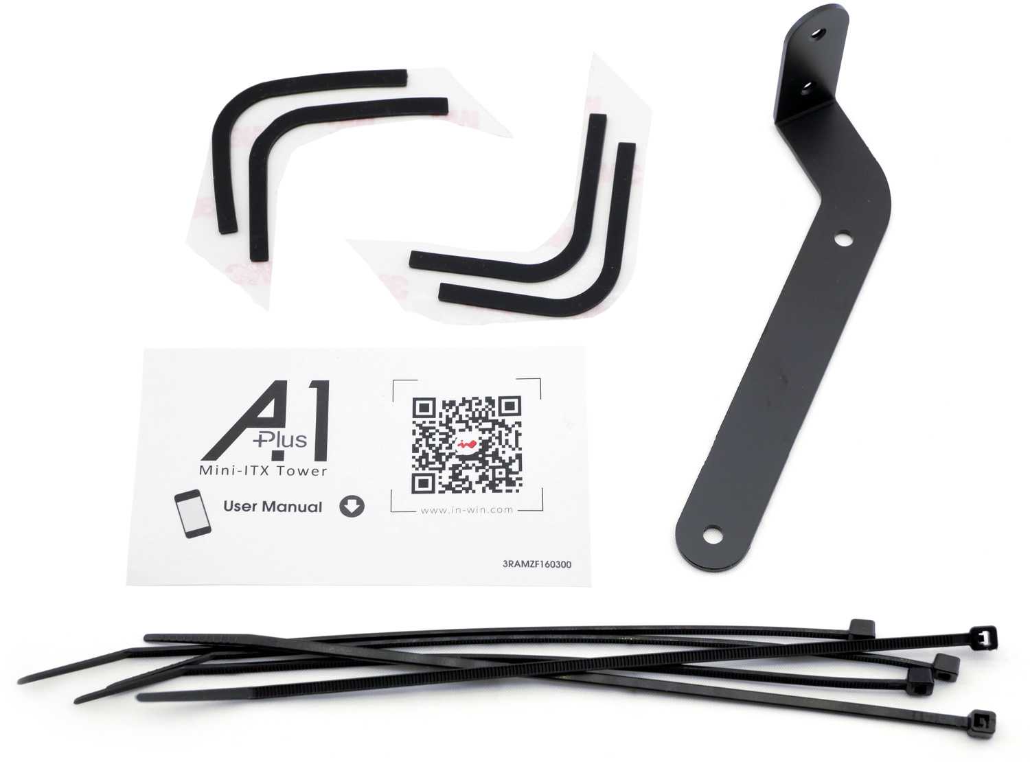 Набор аксессуаров InWin A1 Plus достаточно разнообразен и включает антивибрационные накладки на основание корпуса, электронную версию руководства пользователя, металлический держатель для видеокарты, стяжки для проводов.