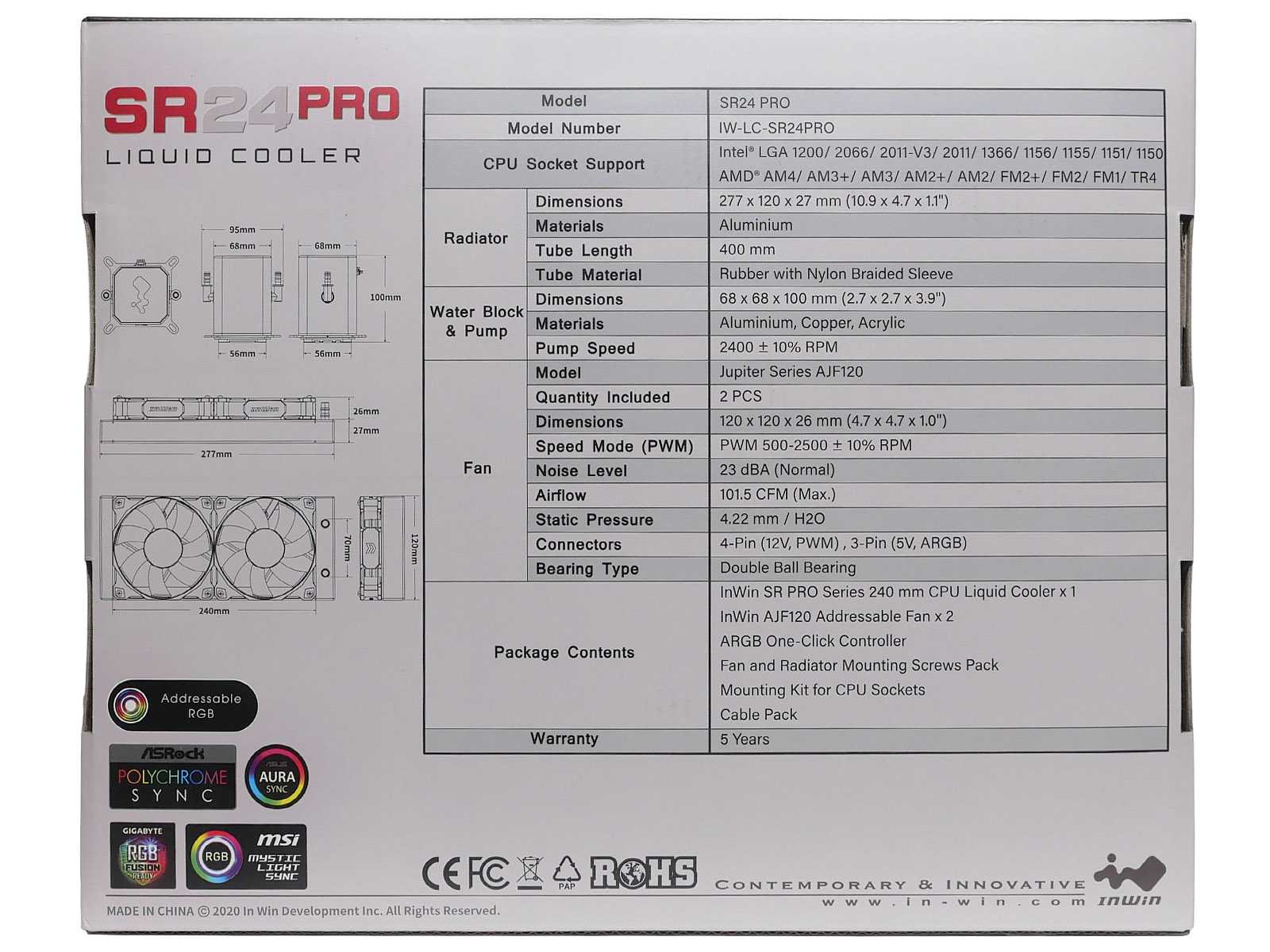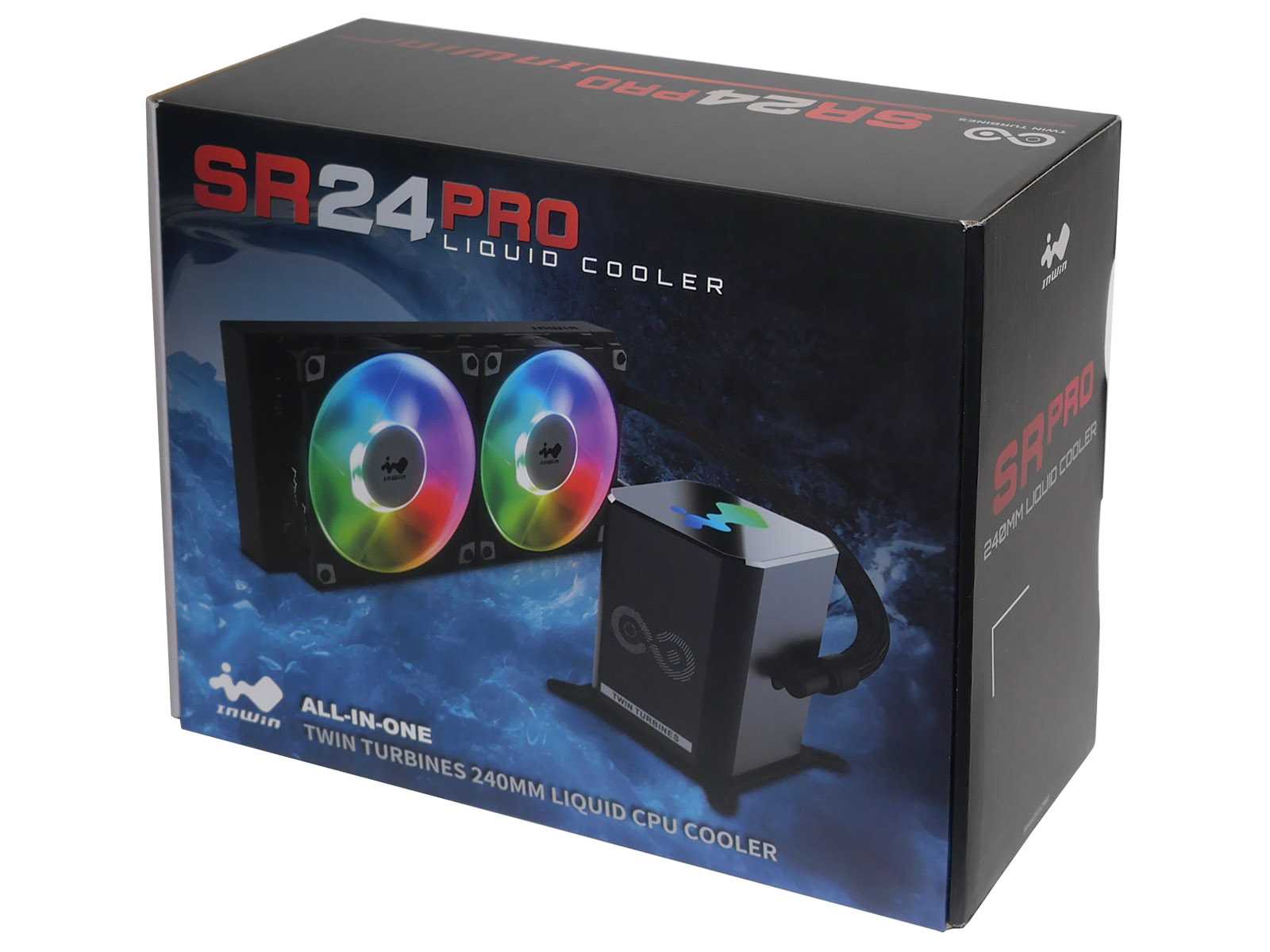 Система охлаждения InWin SR24 Pro продаётся в красочно оформленной картонной коробке размером 332 x 267 x 138 мм. На лицевой стороне производитель разместил фотореалистичное изображение устройства с включенной ARGB-подсветкой. Сразу бросается в глаза особенность СЖО — высокий водоблок.