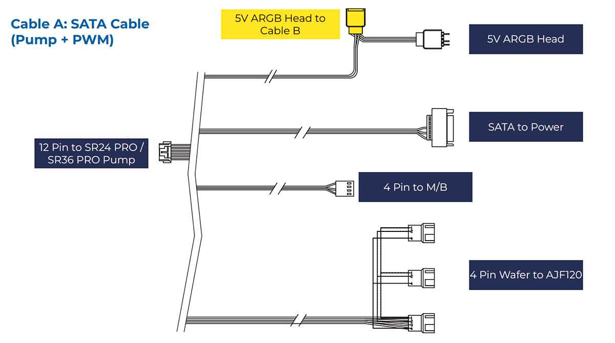 - Проводной адаптер для подключения к помпе вентиляторов и синхронизации подсветки (PWM — 24 см, SATA — 50 см, PWMx3 — 60+10+10 см и ARGB — 40+5,5 см).