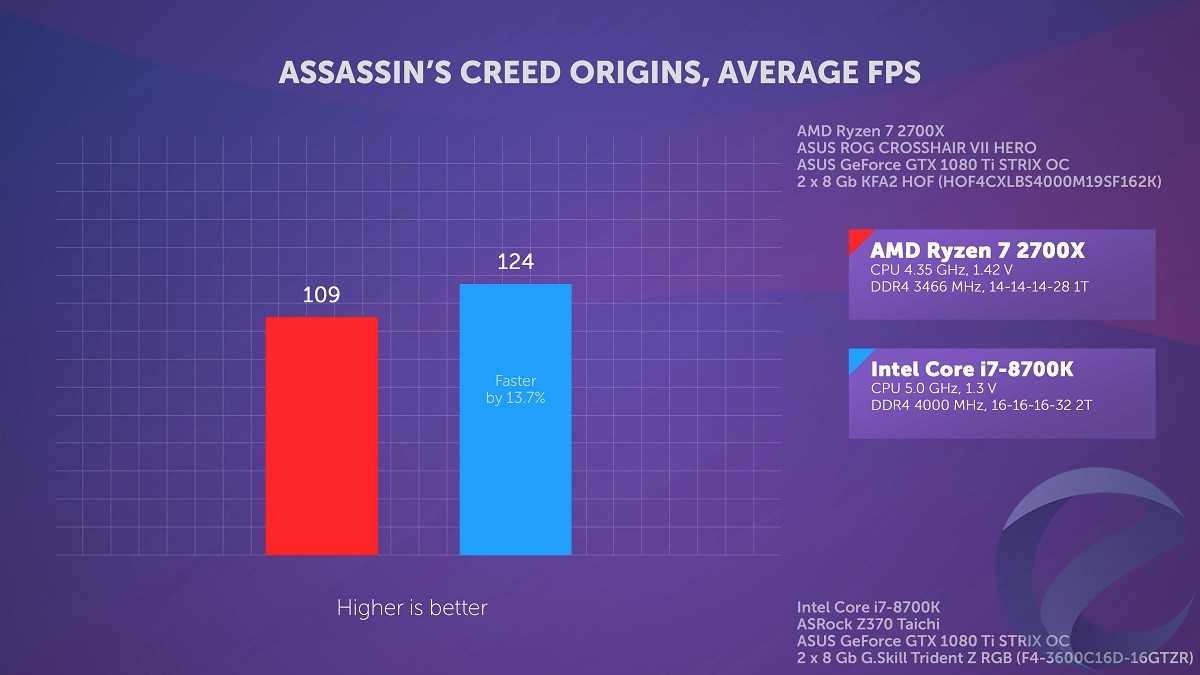 Перейдем непосредственно к играм. Если посмотреть на ситуацию с оценкой результатов прироста производительности на Intel Core i7-8700K от разгона, то можно увидеть закономерность. В играх, где увеличение пропускной способности памяти и IPC давало большой скачок кадровой частоты, герой обзора серьезно преобладает над AMD Ryzen 7 2700X: